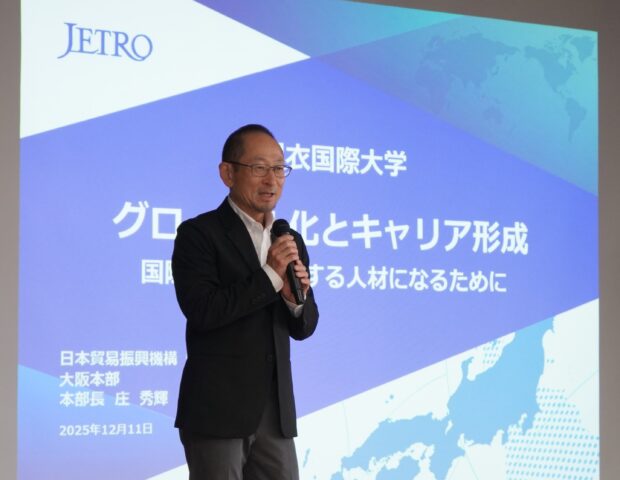 経済学入門に独立行政法人日本貿易振興機構(ジェトロ)大阪本部長の庄秀輝氏をお招きし、「グローバル化とキャリア形成~国際社会で活躍する人材になるために」と題し、ご講演いただきました。