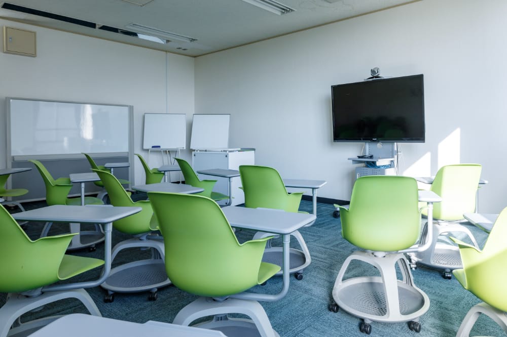 International Conference Room 国際交流を深めることを目的に、海外協定校とWeb会議や交換授業が開催できる設備を整えた教室です。机がついた可動式のいすで、仲間同士で伸び伸びと学習に取り組めます。
