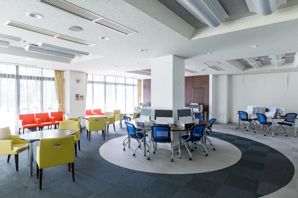 学生ホール くつろぎのスペースであるとともにキャンパスライフの情報発信スペースです。設置されているパソコンは、いつでも誰でもインターネットにアクセスOK。