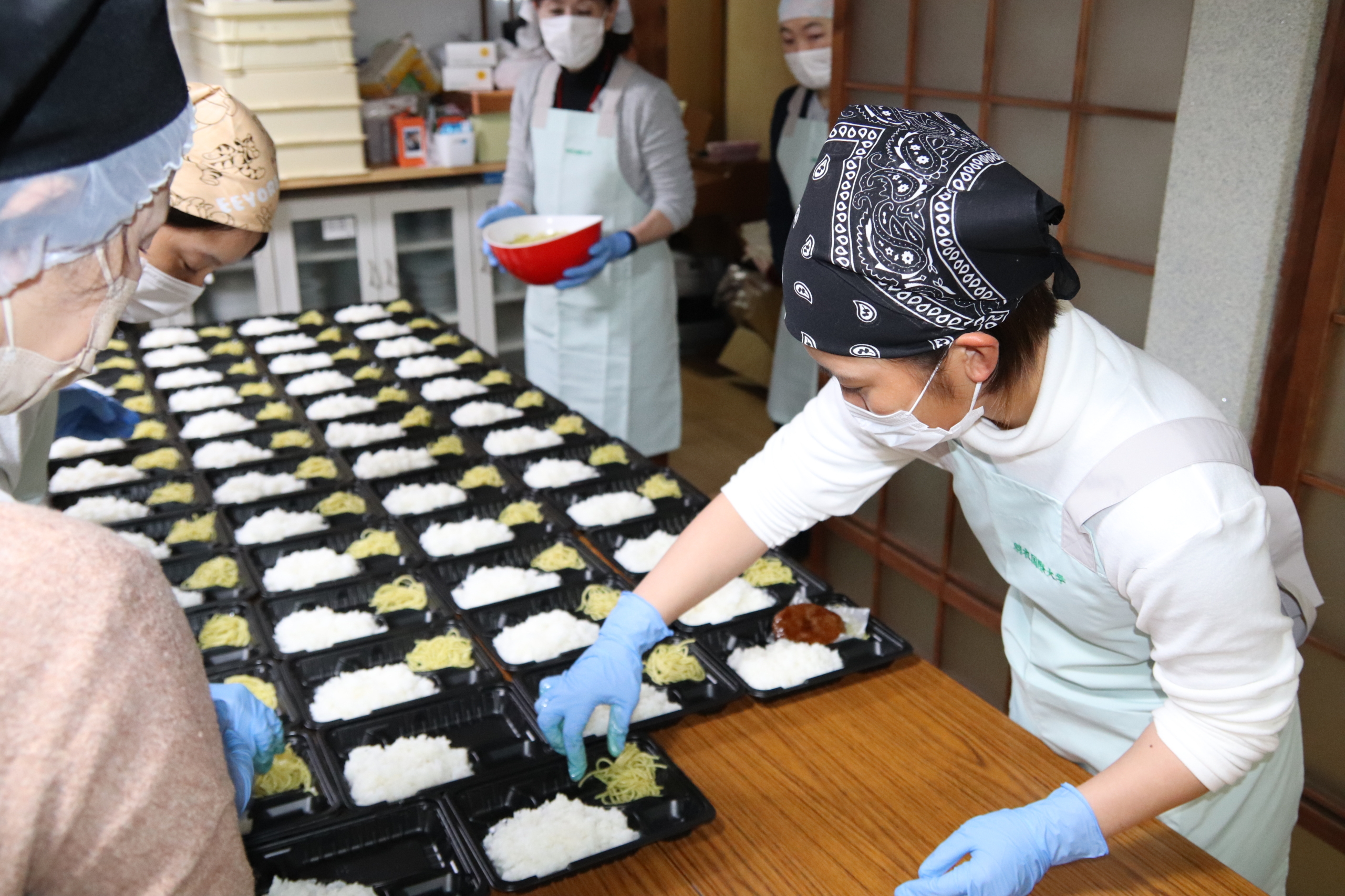 このプロジェクト演習では子ども食堂への支援として、献立開発を行っています。その中で現地の様子を把握するために、「いづはまスマイル食堂」を訪問し、150食のお弁当の盛り付け、配付を担当させていただきました。