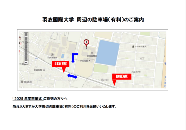 大学周辺での路上駐車や無断駐車は、近隣の方のご迷惑となりますのでご遠慮ください。