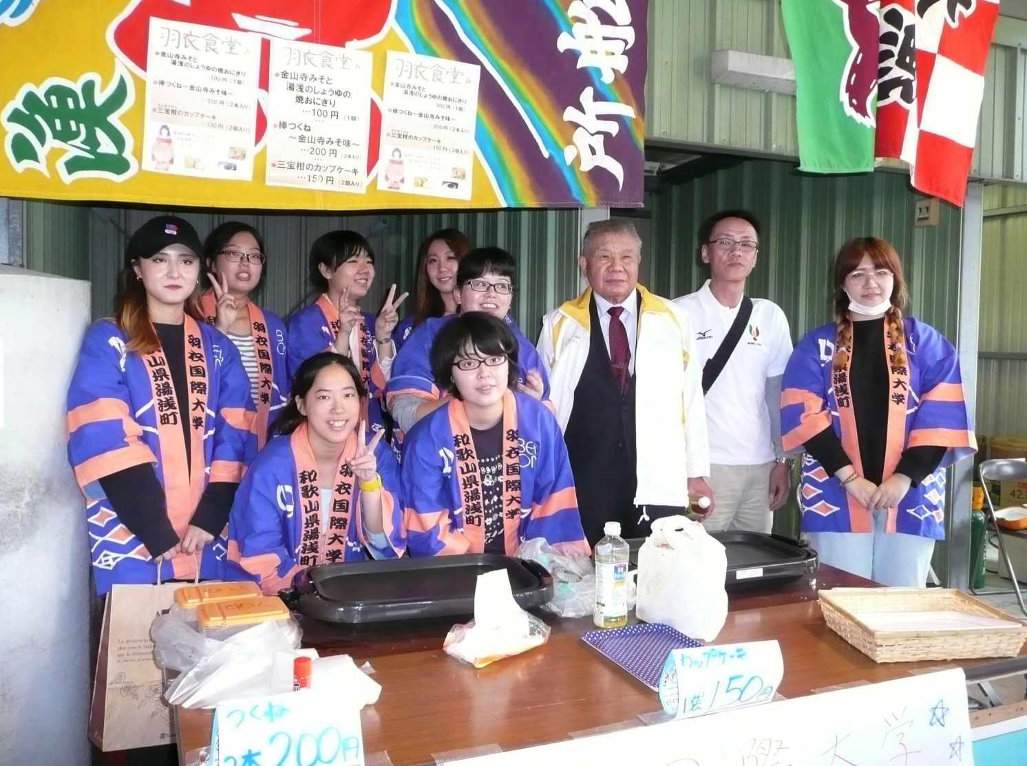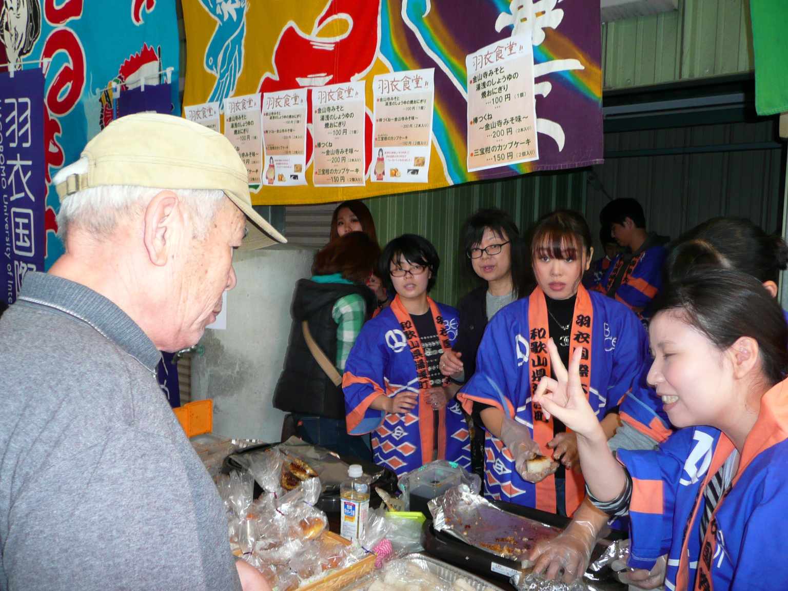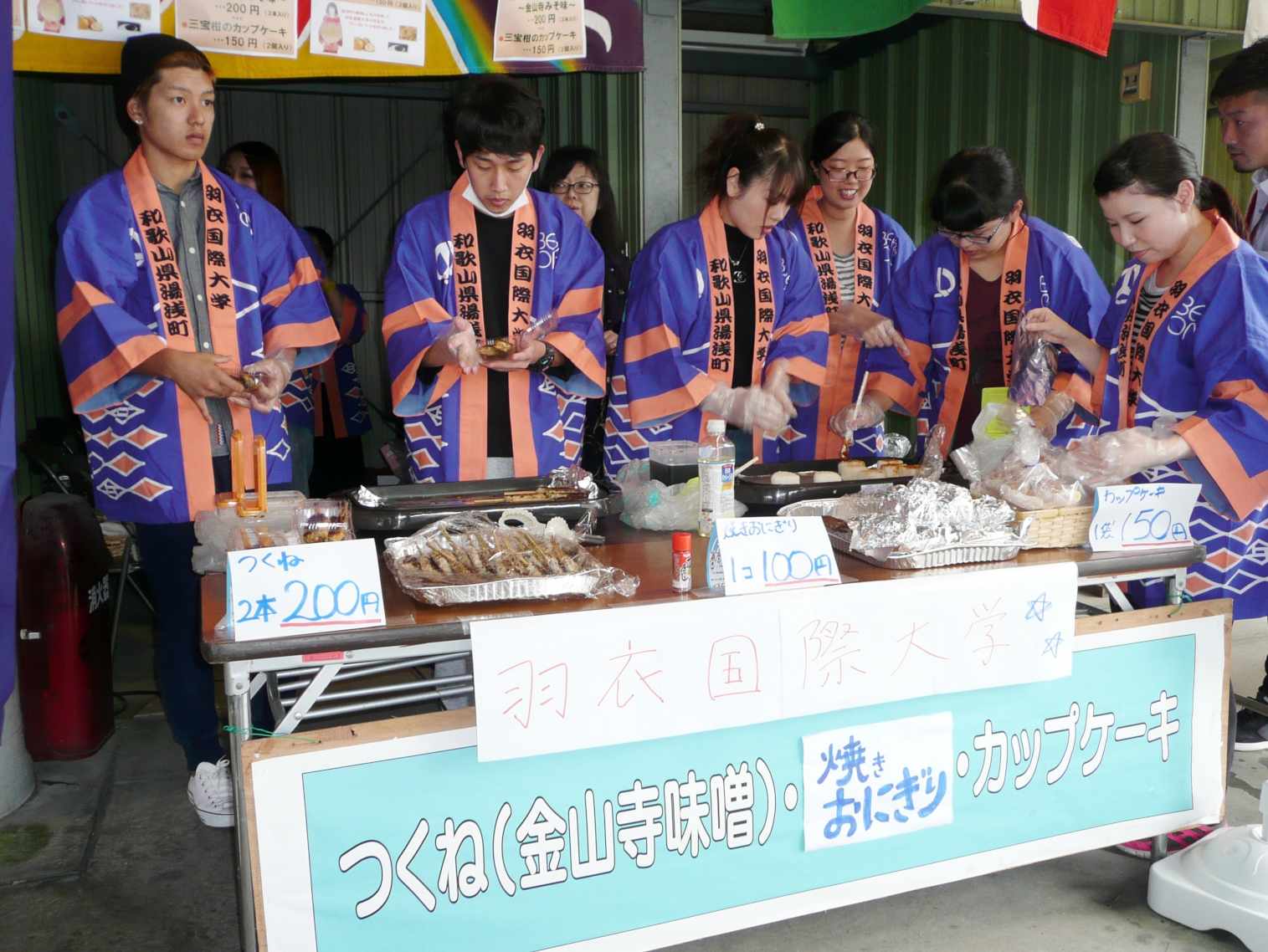 2016年10月23日(日)、和歌山県湯浅町の人気祭「紀州湯浅のギョギョッとお魚まつり」で、食物栄養学科の学生たちが考案・調理したファーストフードをグルメ会場に開店した「羽衣食堂」で販売しました。現代社会学科の有志も売り子として羽衣食堂に立ちました。
