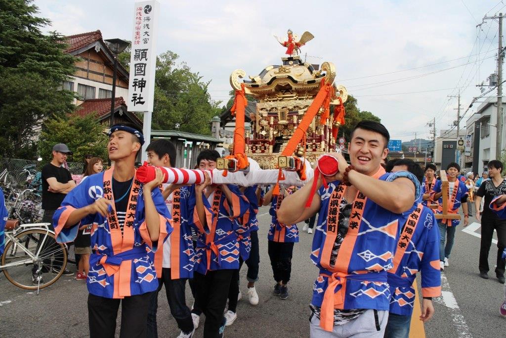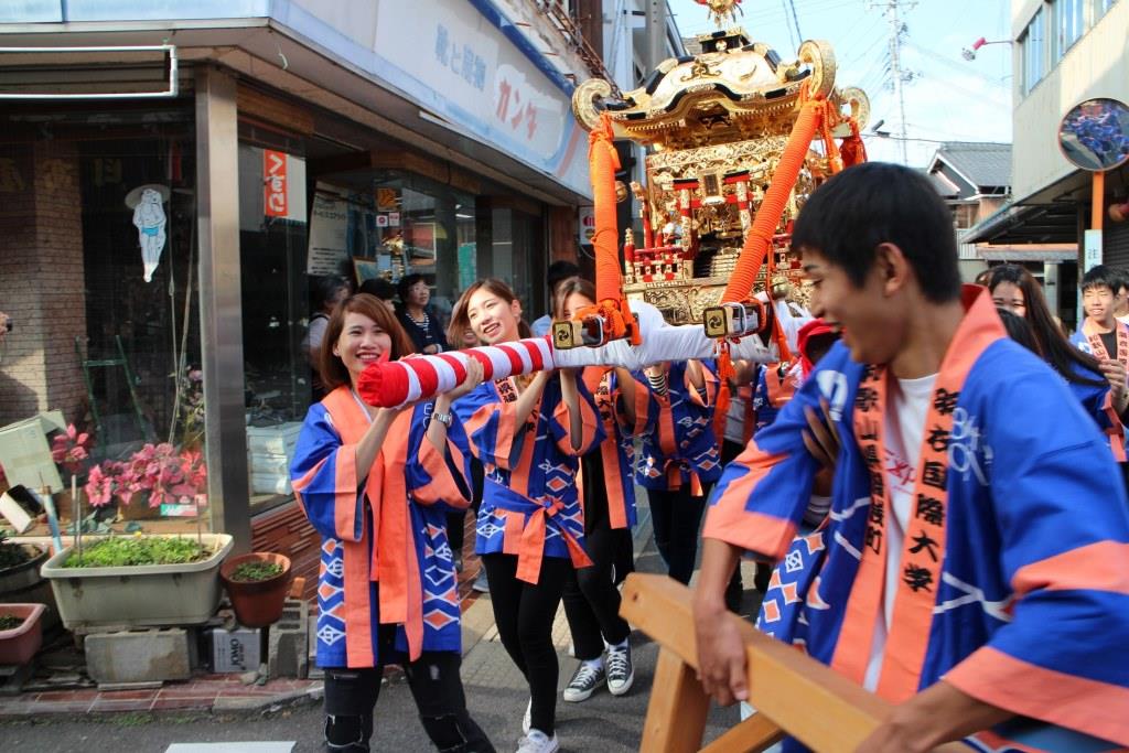 2016年10月18日(火)、湯浅町にある顯國(けんこく)神社の秋祭りで本学の学生が神社の本神輿をかつぎました。今年で3年目。平日となった今年は学生を送ることができるかどうか危ぶまれましたが、和歌山県の「大学のふるさと」第1号大学として、また湯浅町民たちの熱い要望に応えるために、26名の学生が顯國神社からお旅所の北恵比須神社までの4kmの道のりを、お神輿をかついで渡り歩きしました。