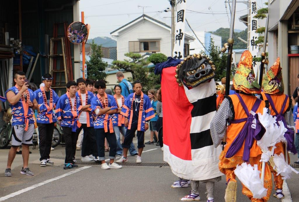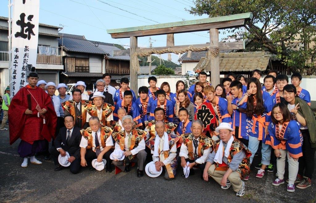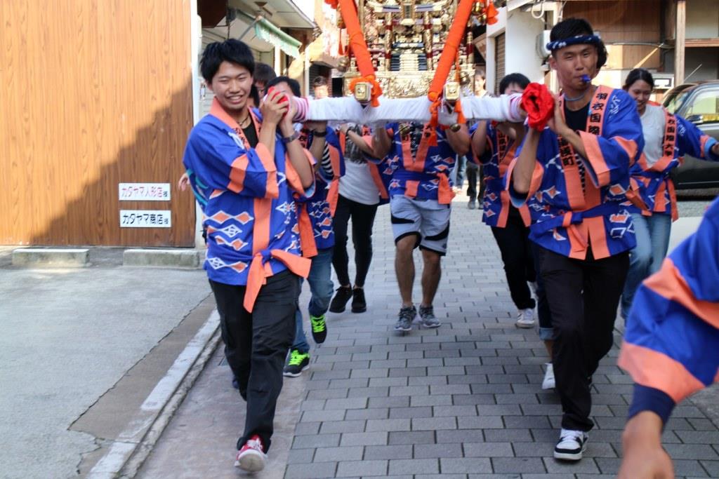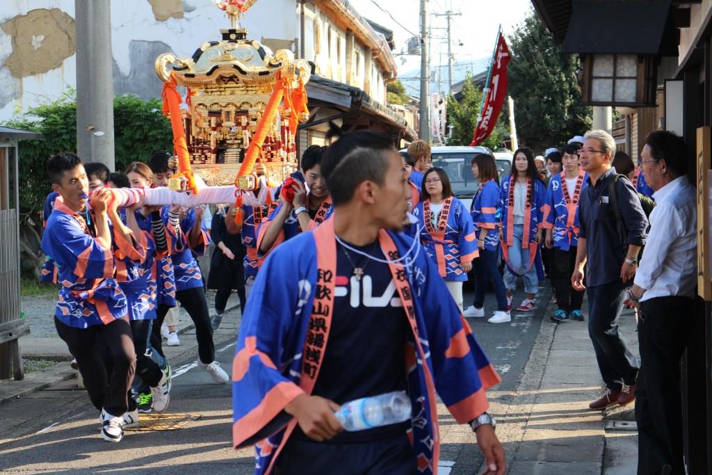 今年のメンバーの中には、地元で‘たんじり’を曳いている学生たちが数名いたこともあり、「わっしょい!」とお神輿をかつぐだけでなく、囃子のように笛を吹き鳴らしながら、100kgを超えるお神輿を肩に乗せて町中を疾走しては、道の角々でお神輿の‘やりまわし’を披露しました。本学が所在する泉州の祭と湯浅町の祭との融合スタイルに、初めは心配そうにご覧になっていた長尾宮司様や総代の皆さんも、目をまん丸くして驚かれていた町民の皆さんも、学生たちの奮闘ぶりに「活気があってとってもよかった!」と手を叩いて喜んでくださいました。