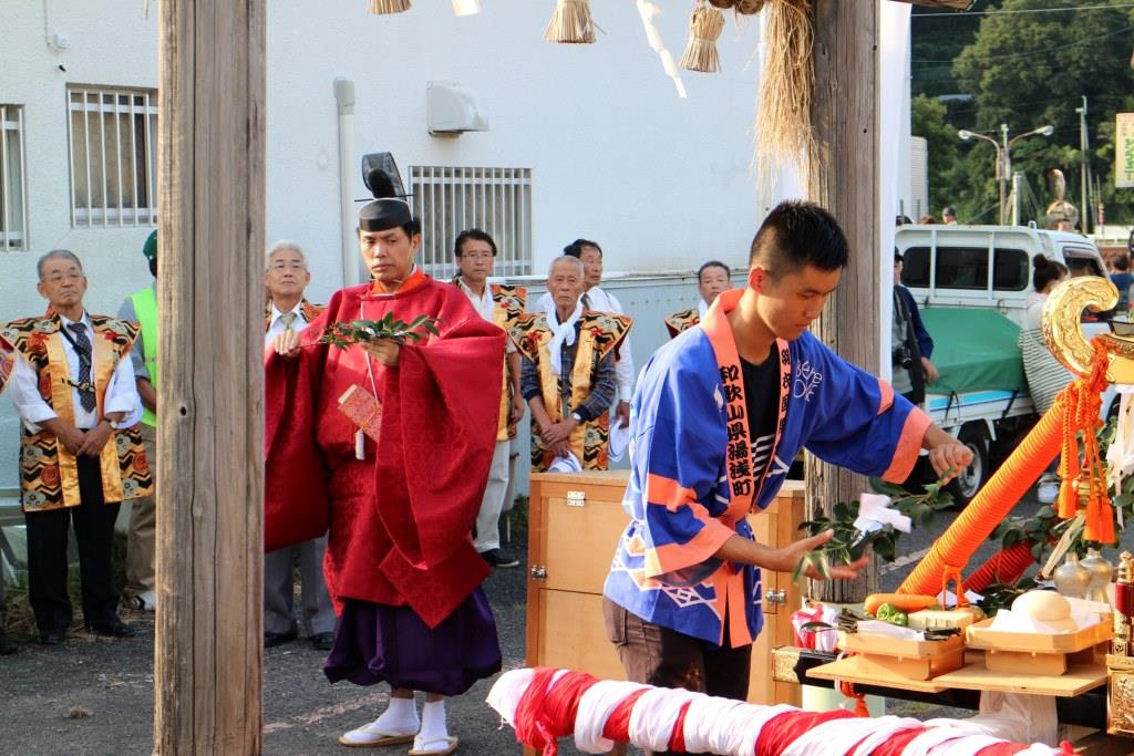 夕方にたどり着いたお旅所の北恵比須神社で行われた神前式では、やりまわしのリーダーとなった学生、清原大輝さんが本学代表として玉串を奉納しました。