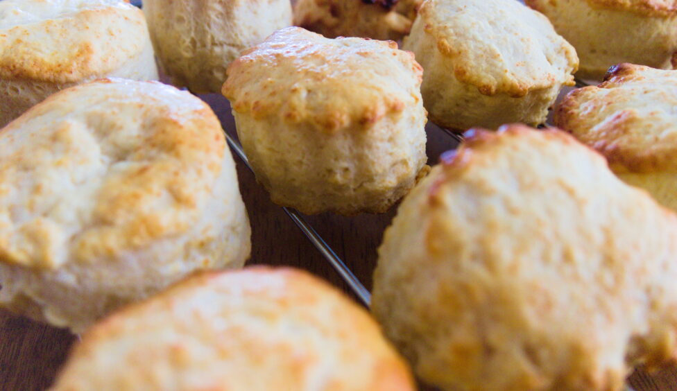 大学の授業「調理実習基礎」で実習しているイングリッシュスコーンと手作りジャム。動画で作り方を視聴した後は実際に作って、できたてのスコーンにジャムを添えて試食します。
