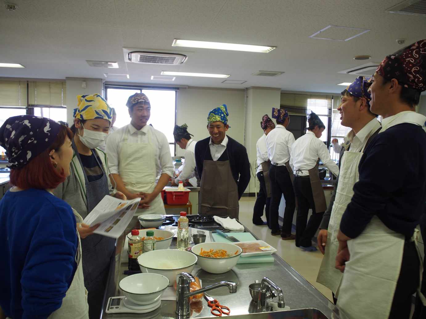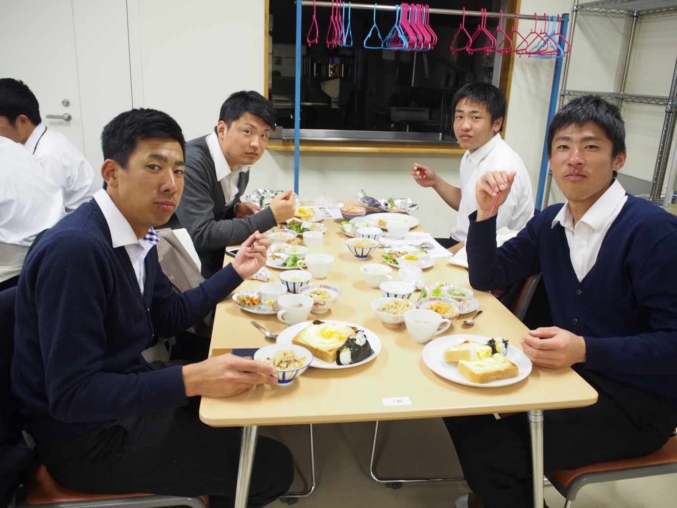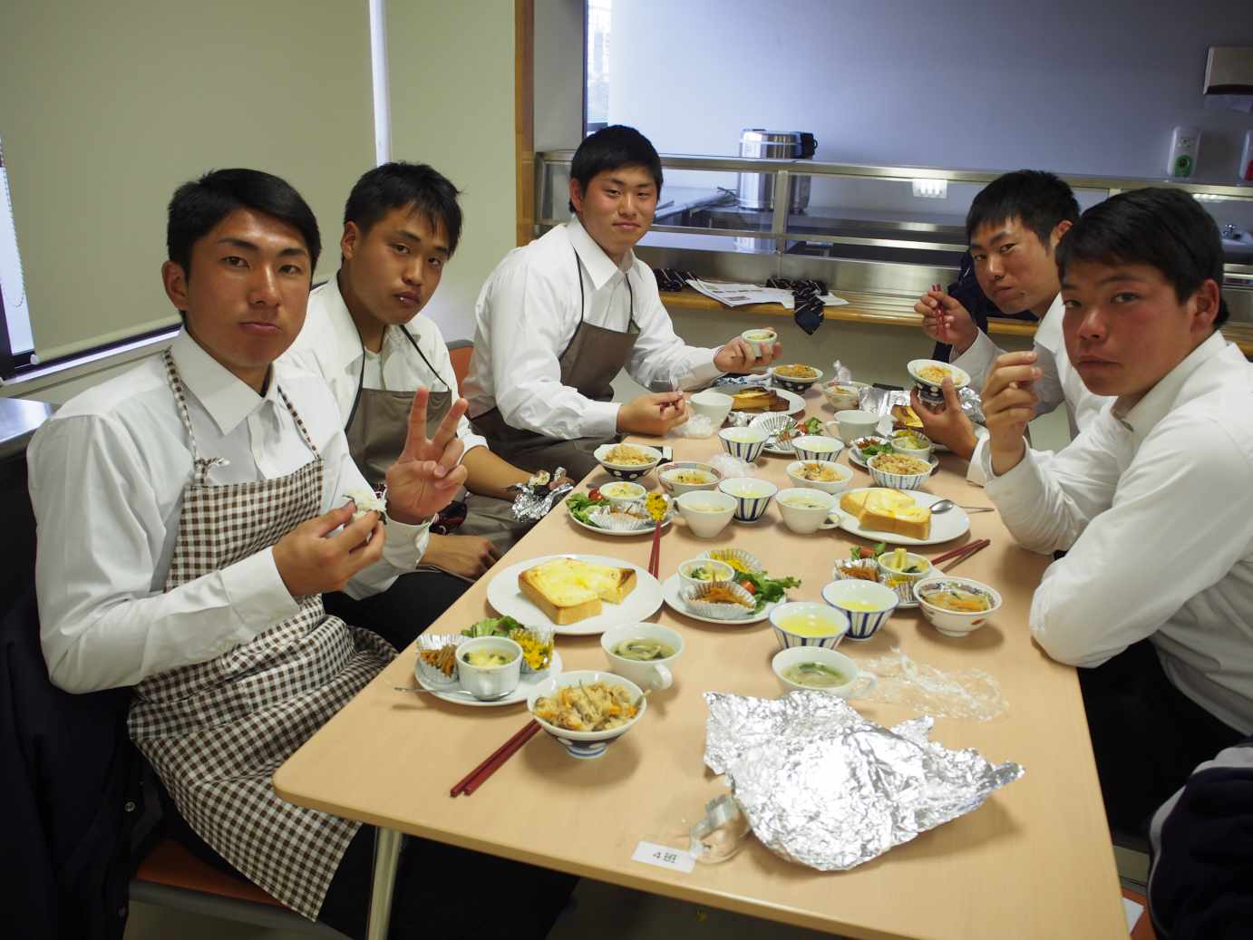 2017年2月16日(木)、その集大成として「自らが自分の目的に合わせた食事を調理して栄養管理ができるようになること」を目的に、食物栄養学科の学生8名(4年生6名、3年生2名)指導による硬式野球部員(1,2年生)対象の調理実習を開催しました。