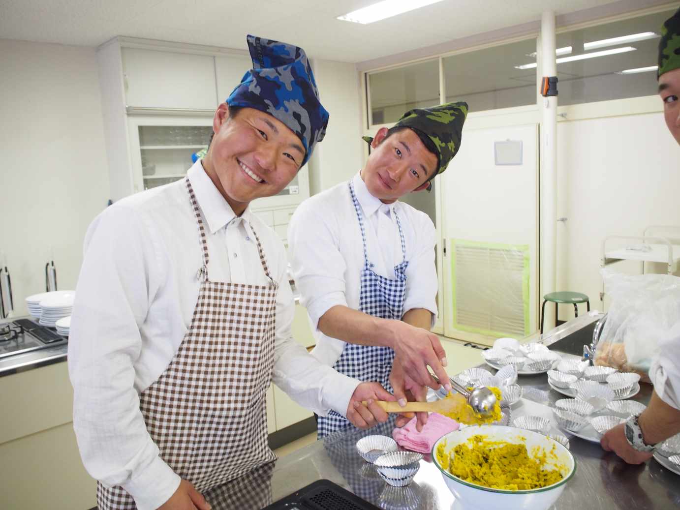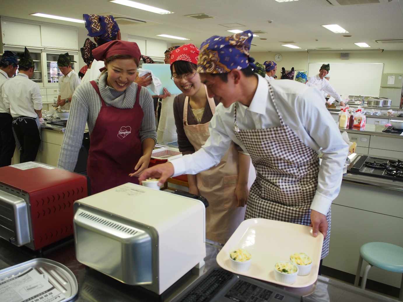 硬式野球部員は5〜6名のグループに分かれて、それぞれに食物栄養学科の学生の指導のもと手分けして各メニューの調理にあたりました。主食からデザートまで並行しての調理という慣れない作業に苦労しながらも、普段の練習とは違った真剣さで取り組んでいました。