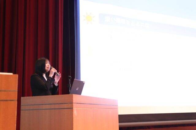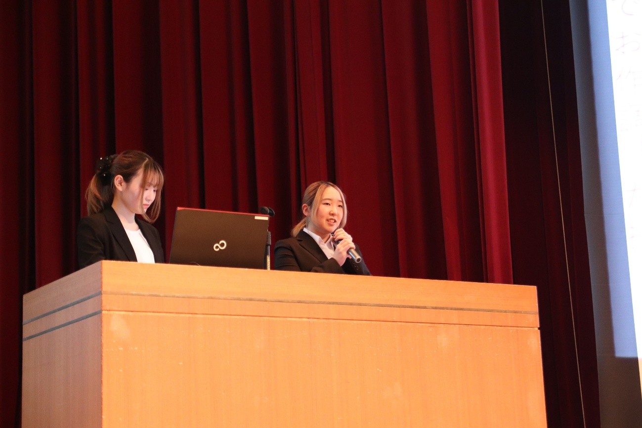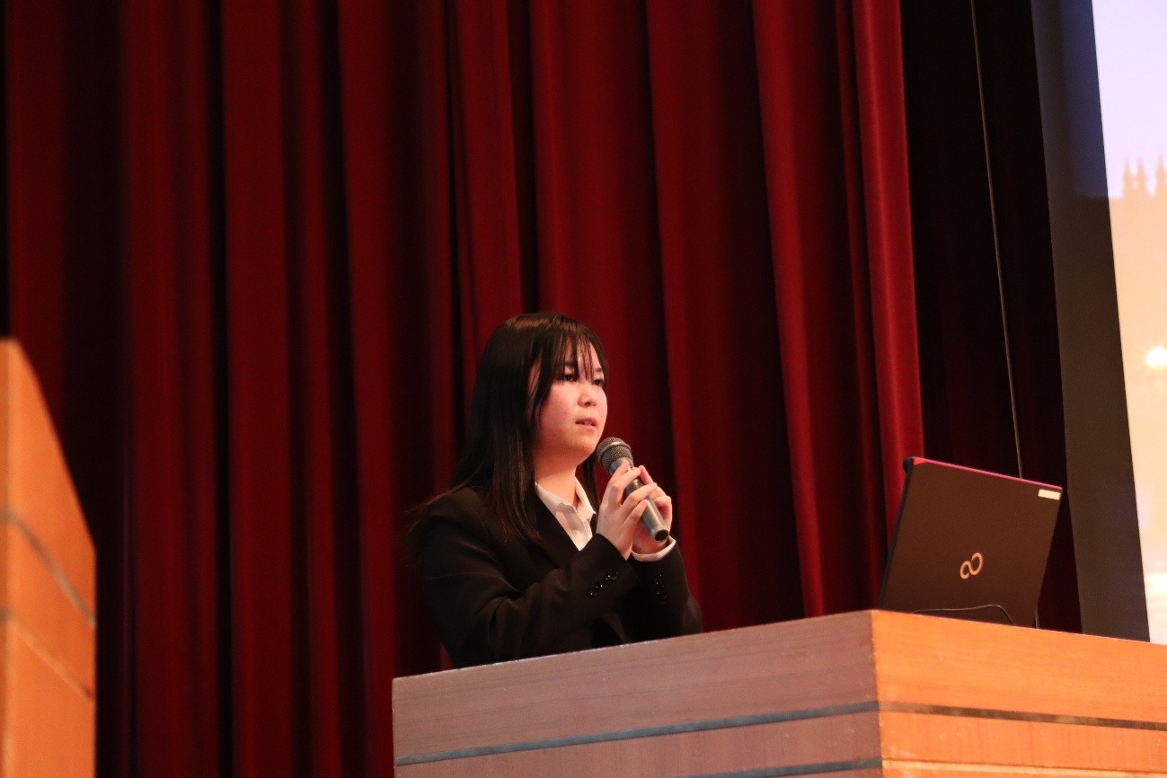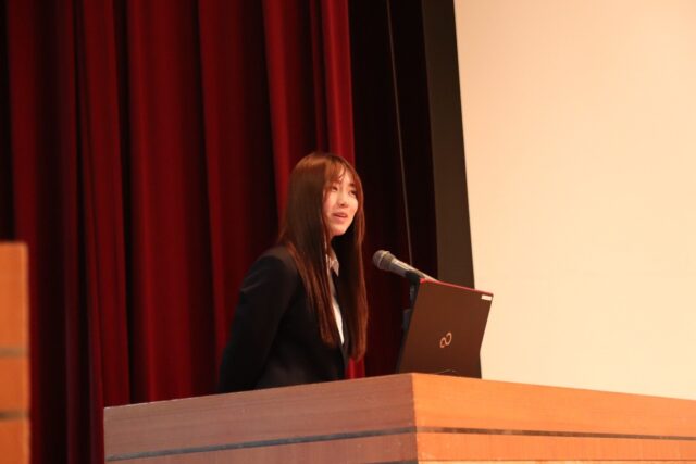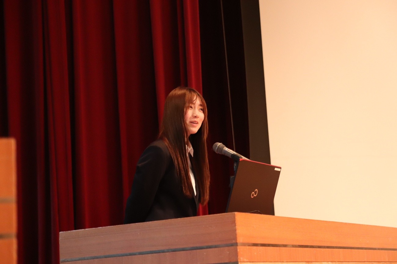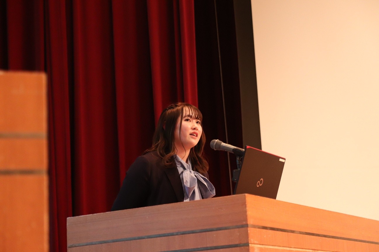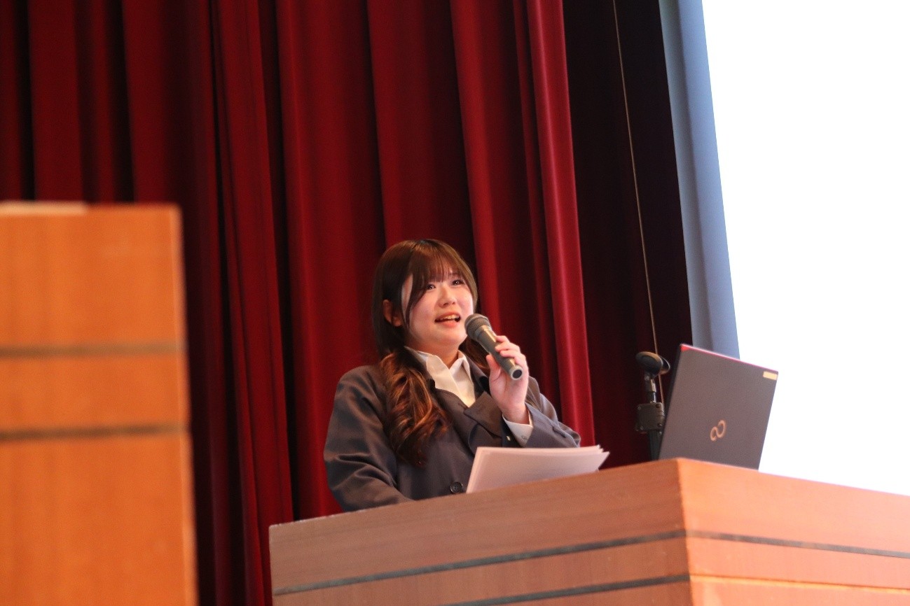 最後に、塚元教学委員長から講評があり、「毎年、学年ごとに特色がありますが、今年は特にバラエティーに富んだ内容でした。その中でも、12組中6組が健康や食に関するテーマを扱っており、これまでにあまり見られなかった特徴だと感じます。また、現代社会学科では3組中2組が留学生による発表で、新しい風を吹き込み、日本人学生にとっても大きな刺激となりました。発表全体を通して、皆さんが自分の生き方や将来について真剣に考えながらテーマを選んでいることがよく伝わってきました。今後も羽衣国際大学での学びを深め、充実した大学生活を送り、将来社会へ羽ばたく際には、今回の『自ら調べ、発表した経験』をぜひ生かしてほしい」との言葉が贈られました。
