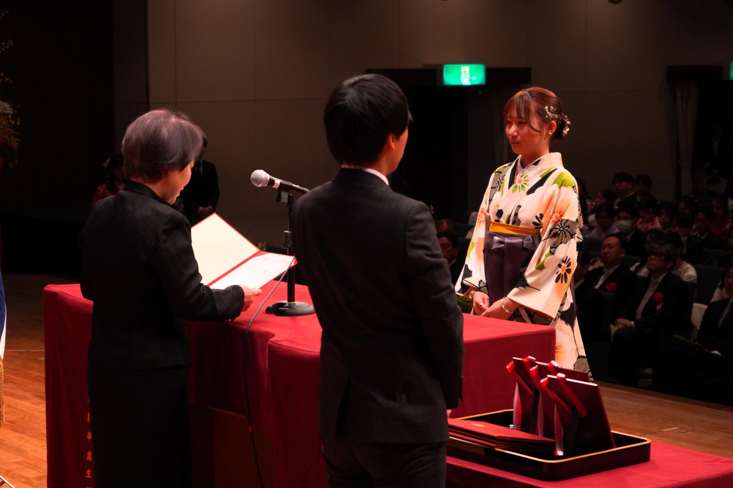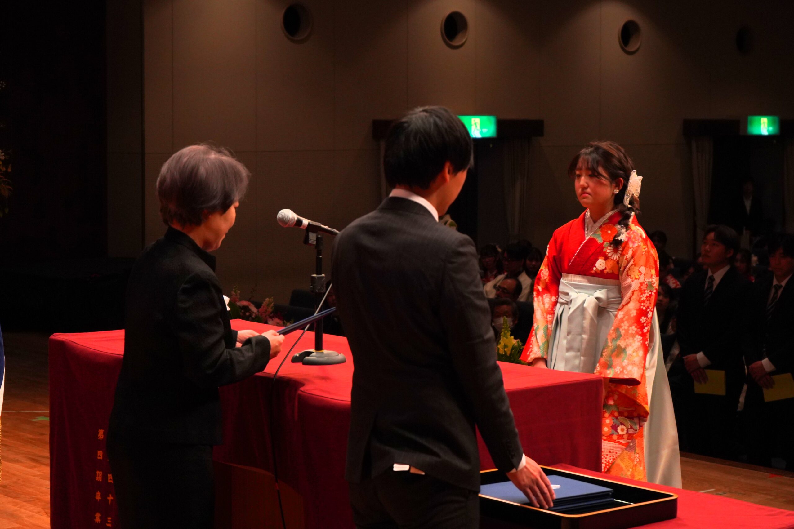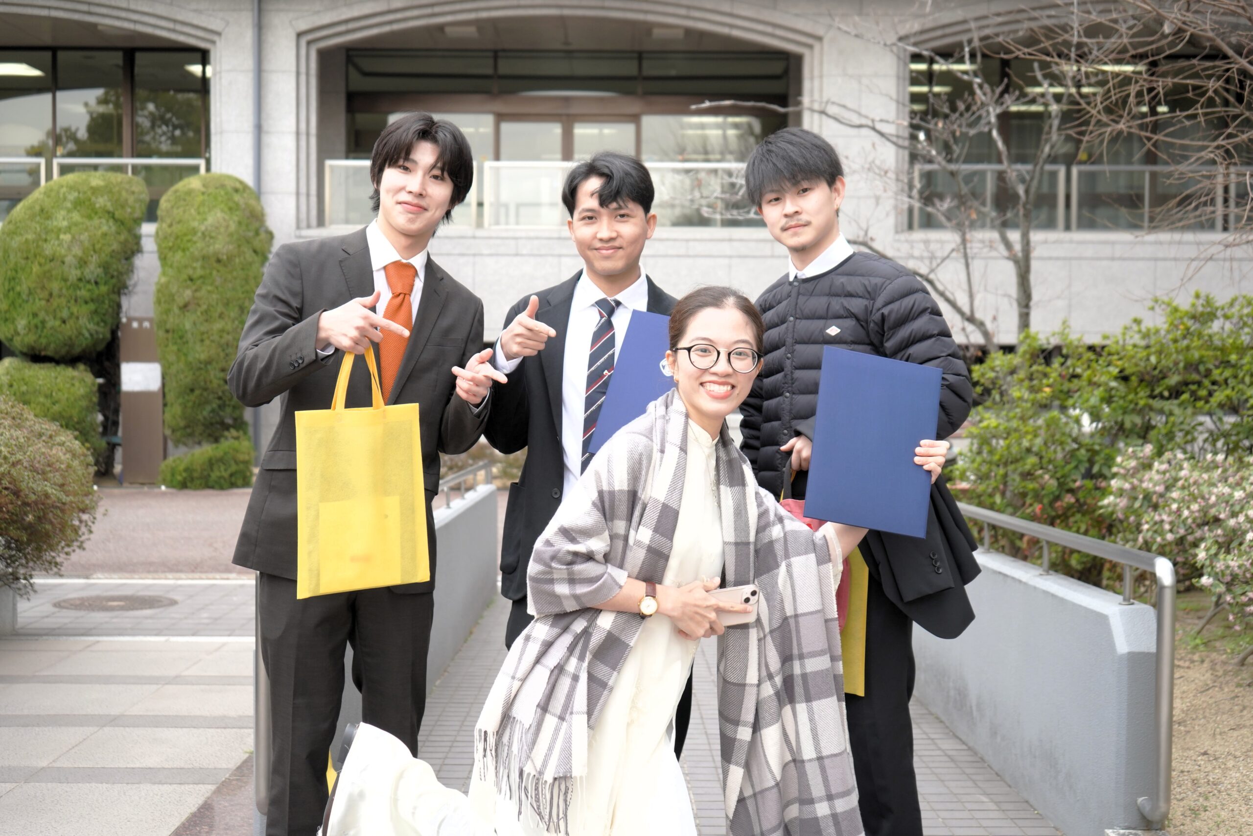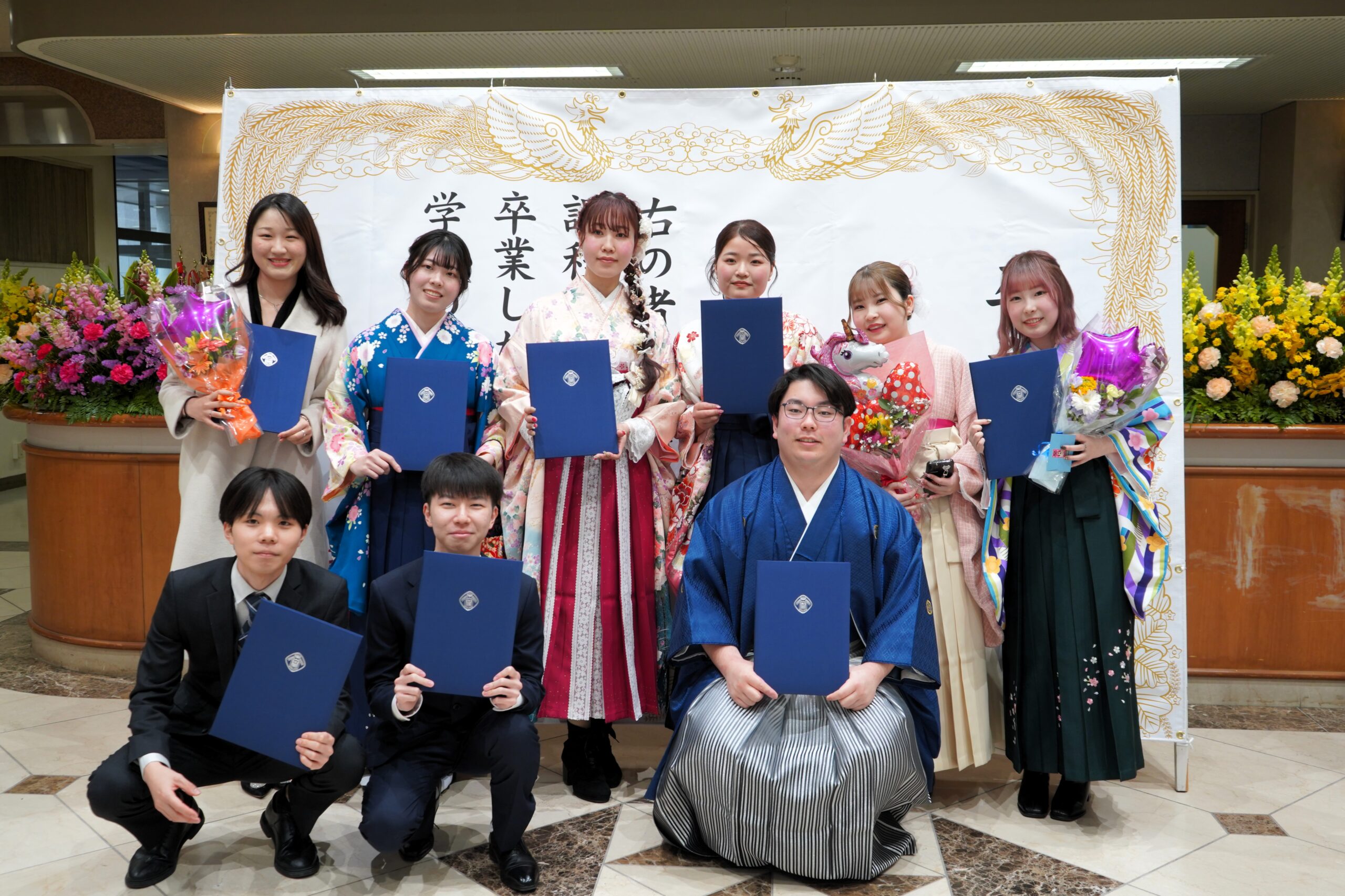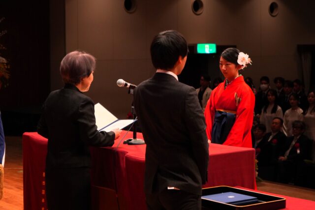 式典後には、担当教員から一人ひとりに学位記が手渡され、フォトスポットでは多くの笑顔があふれていました。