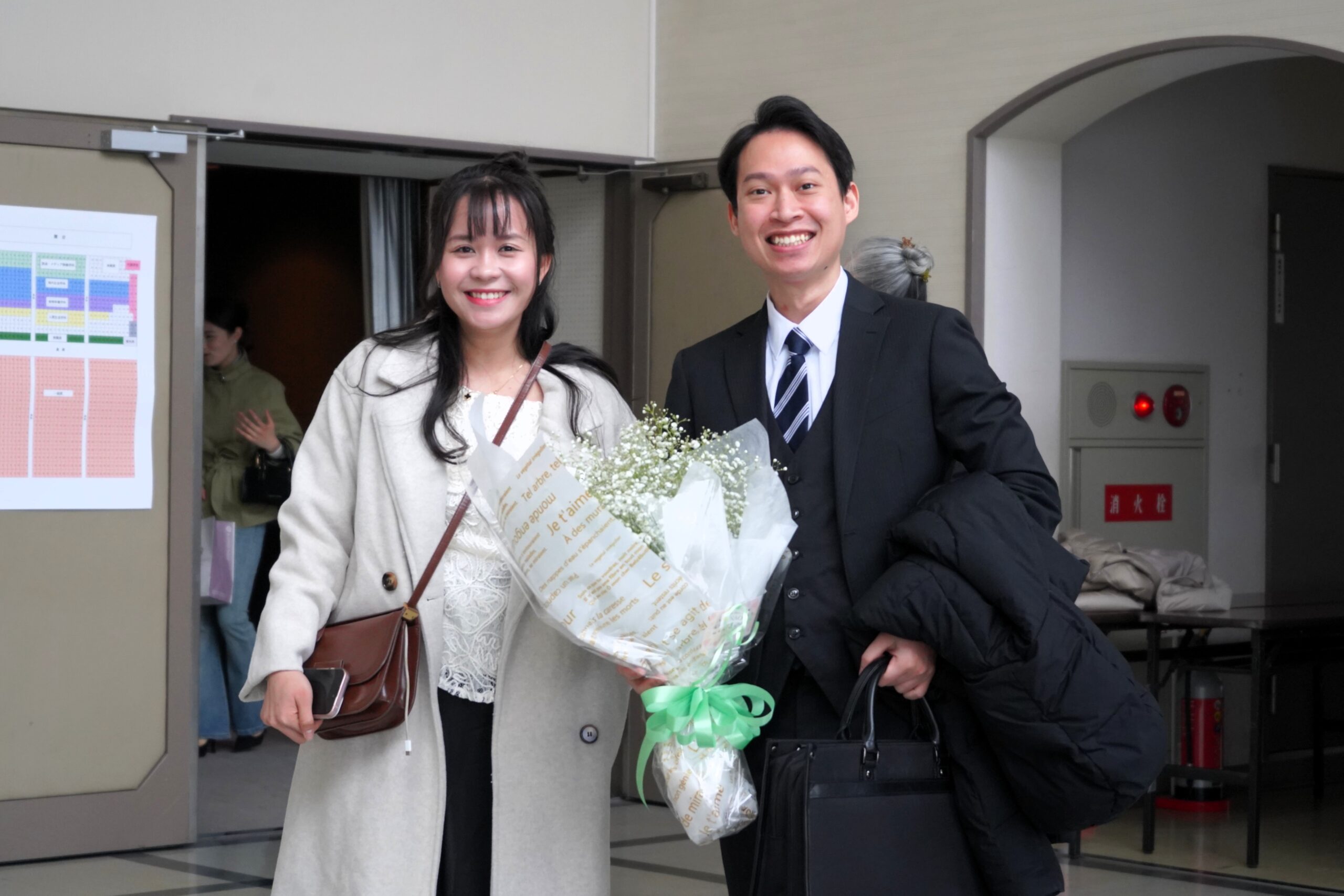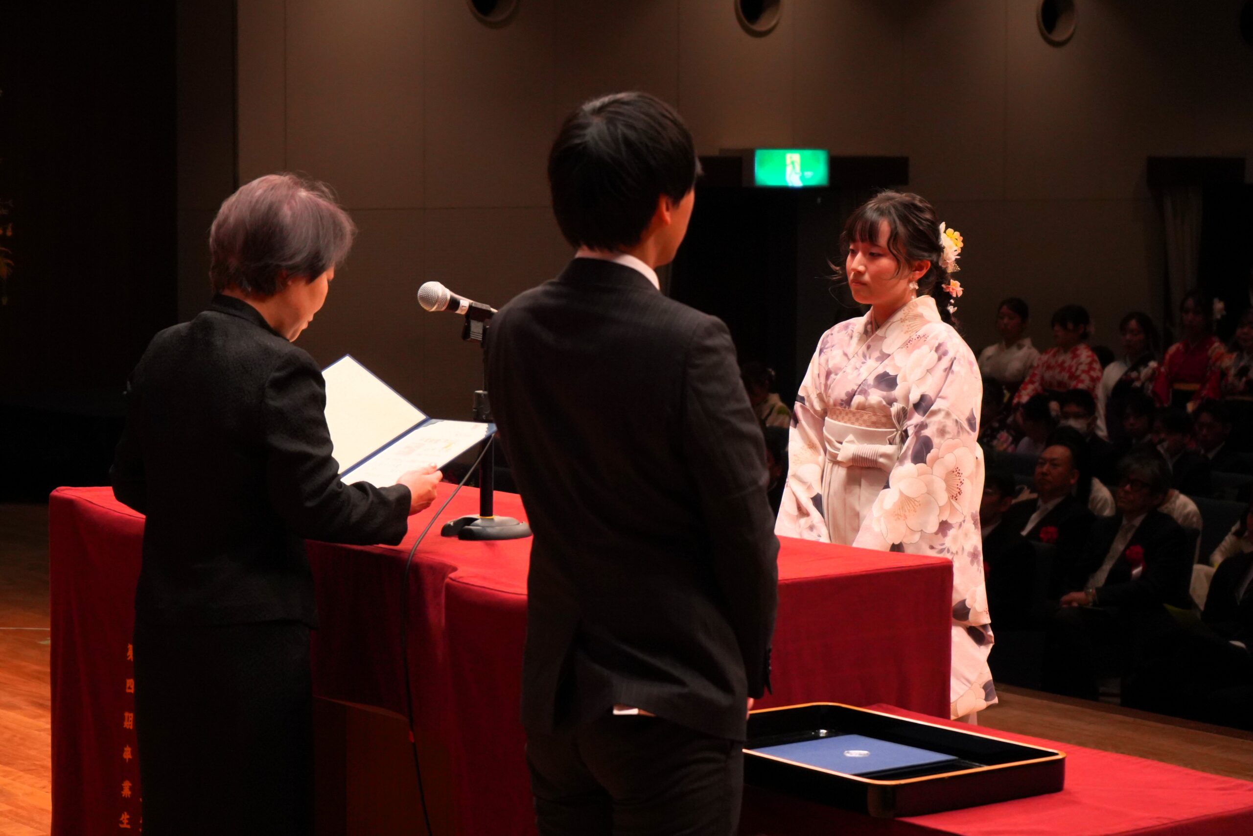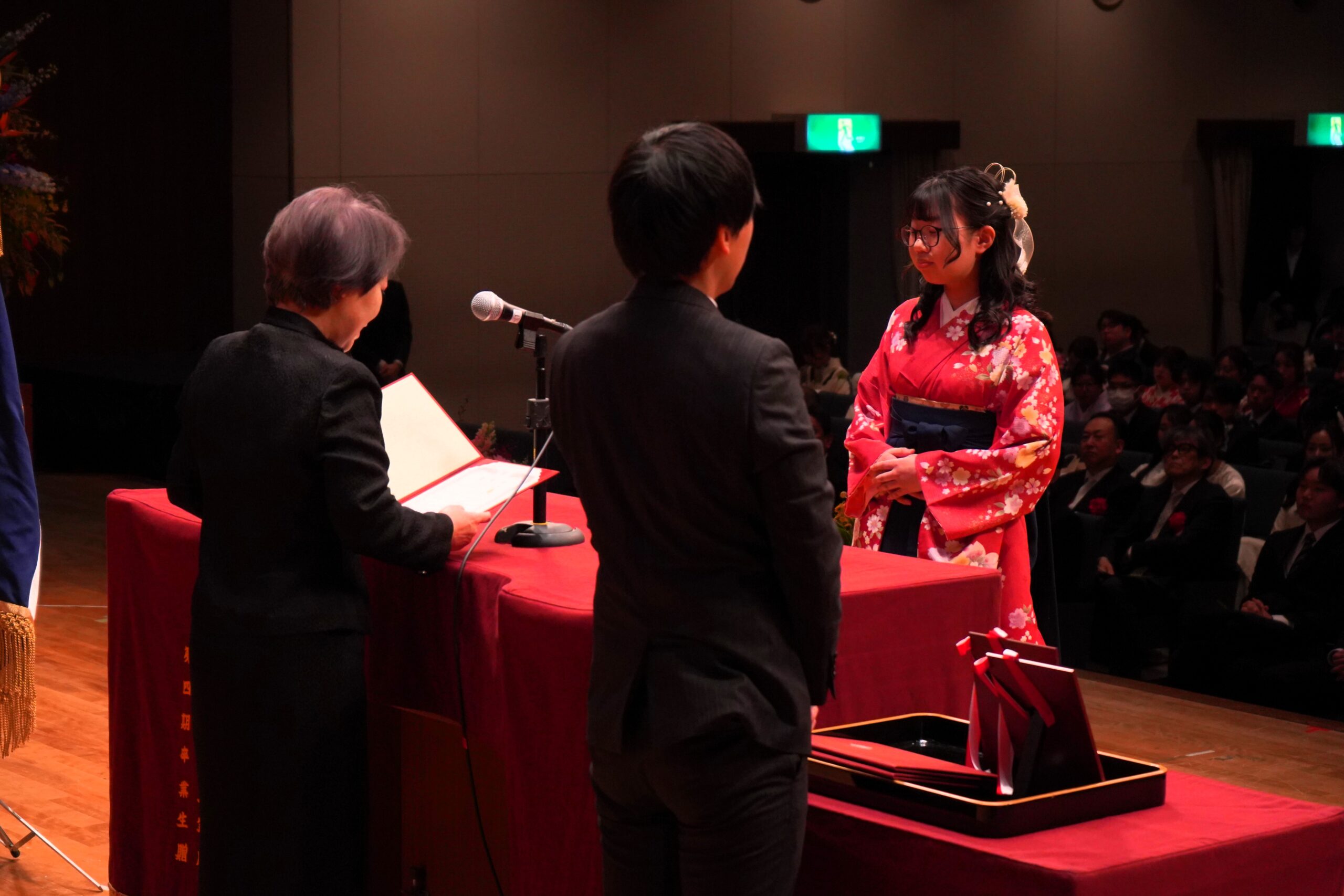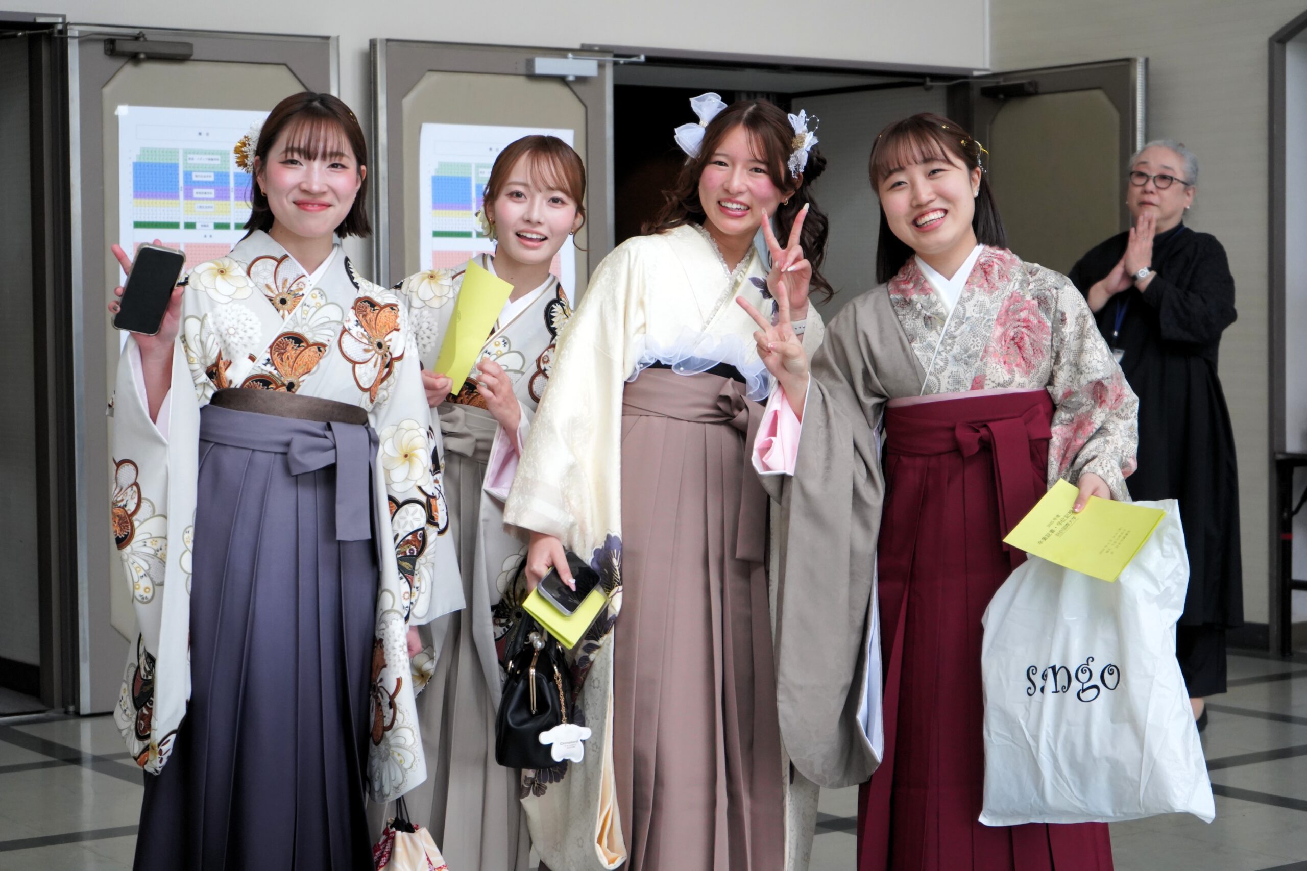 式典後には、担当教員から一人ひとりに学位記が手渡され、フォトスポットでは多くの笑顔があふれていました。