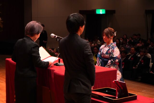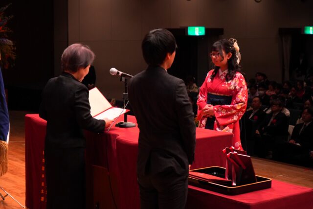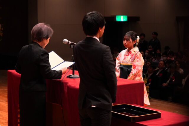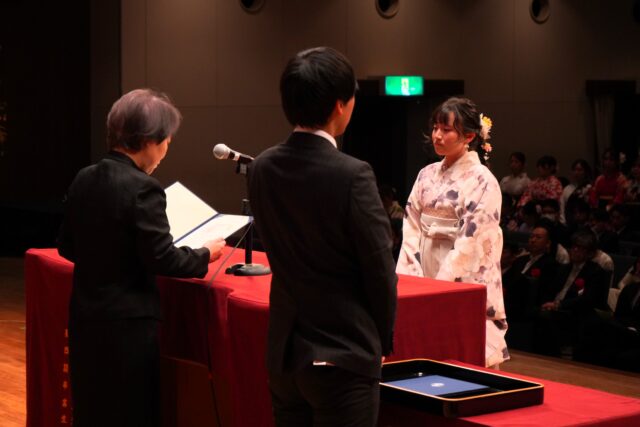 式典では、学業および課外活動において優れた成績を修めた学生に贈られる「学長特別表彰」をはじめ、英語学習や国際交流と専門分野の学びを両立した特別プログラム修了者に対する「GCP(グローバル・チャレンジ・プログラム)学長特別表彰」、強化指定クラブに所属し学業成績が優秀な学生に授与される「BE the ONEスポーツ賞」「BE the ONE文武不岐賞」など、多くの表彰が行われました。