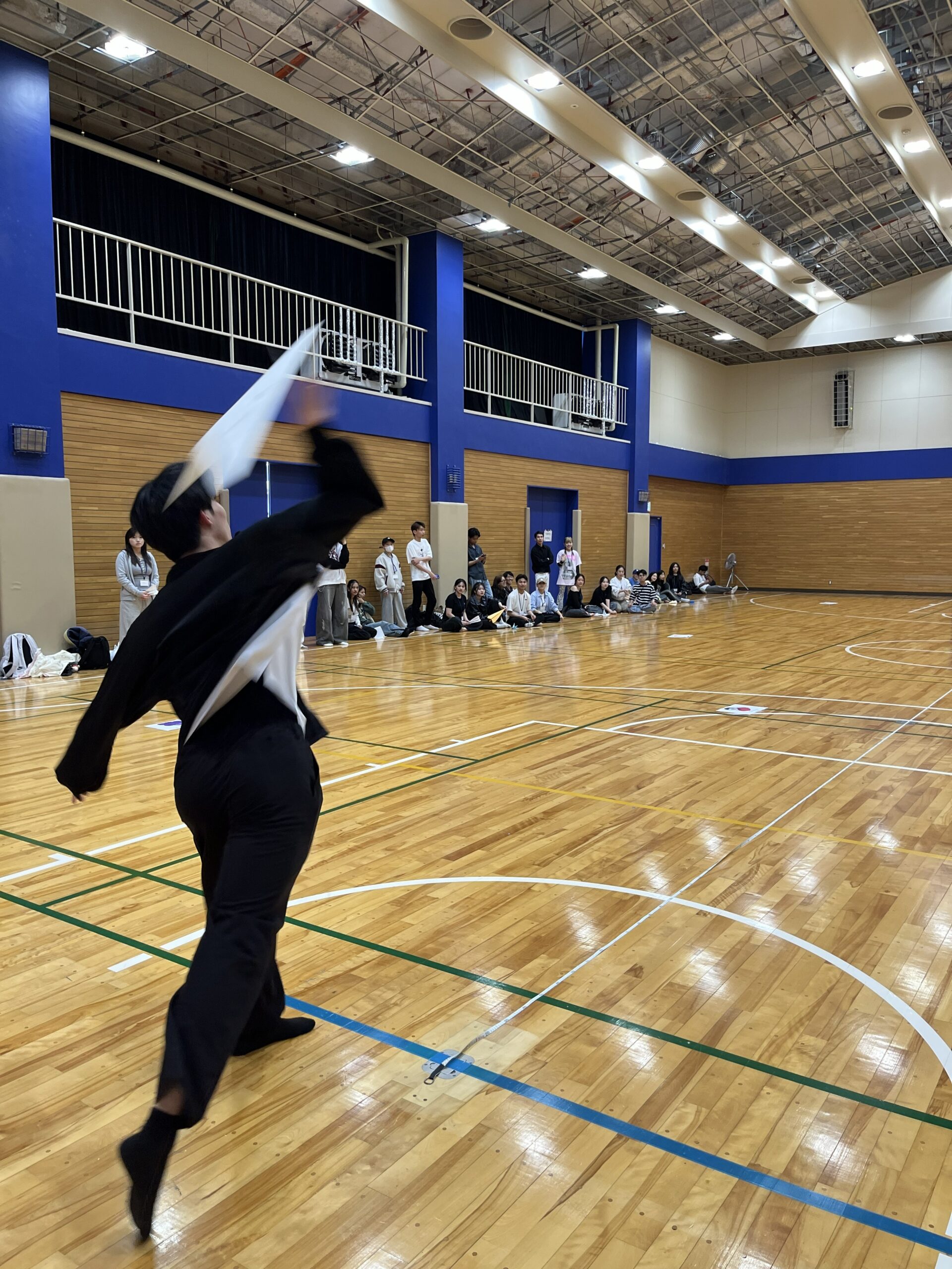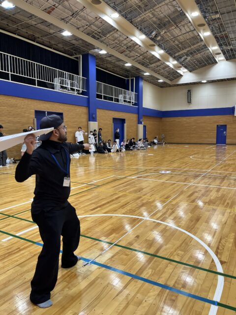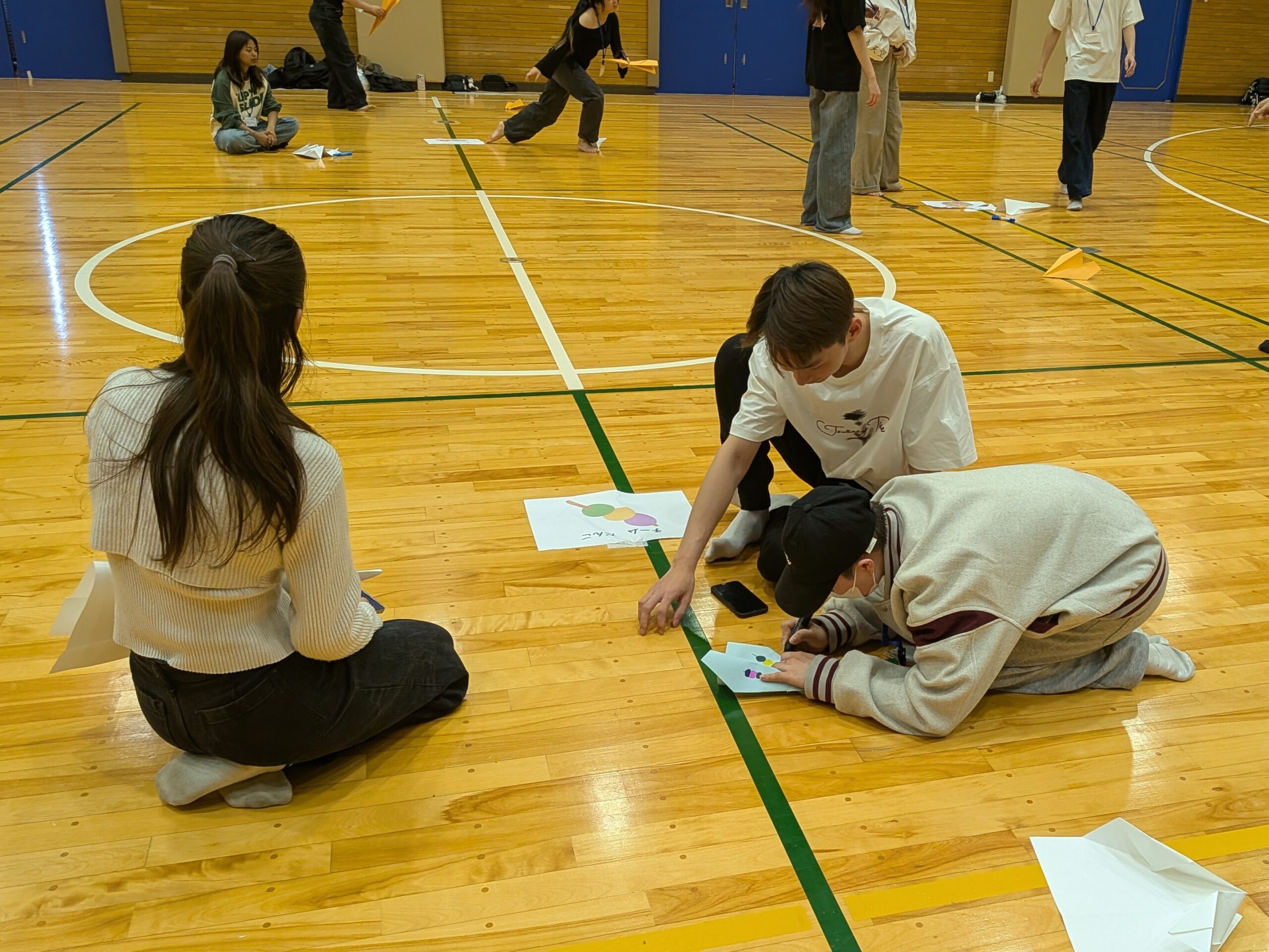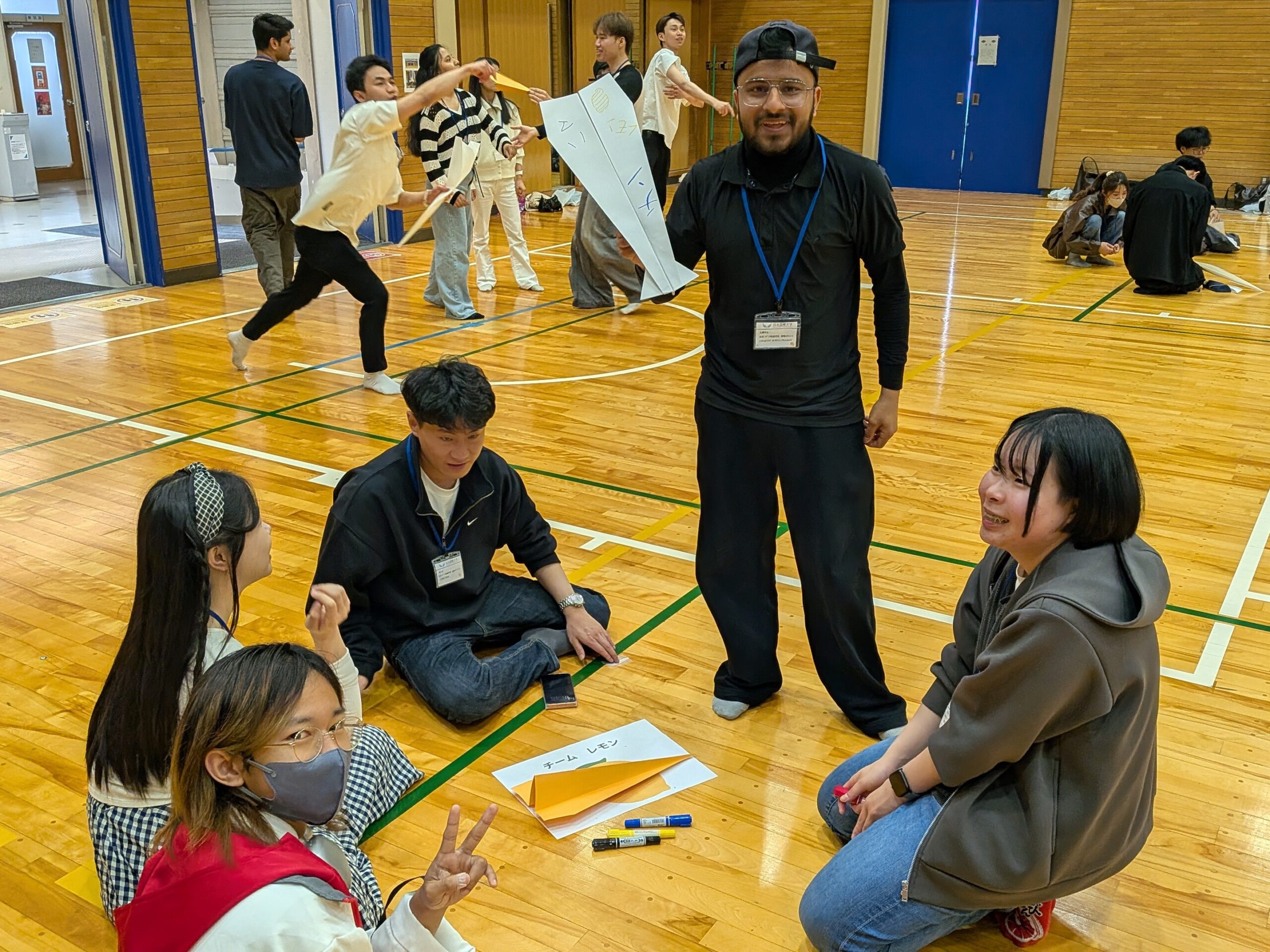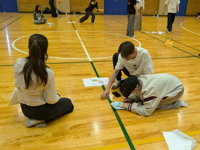 午後はスポーツホールへ場所を移し、「グループ対抗!紙ヒコーキ大会」を実施しました。