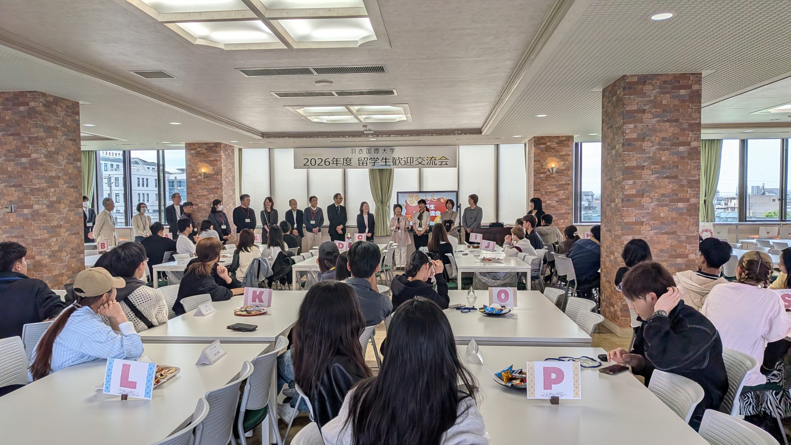 当日は、新入留学生42名、先輩学生 日本人学生8名、教職員14名に加え、羽衣学園短期大学・羽衣国際大学 同窓会 美羽会、教育後援会の皆様にもご参加頂き、総勢68名が参加する大交流会となりました。