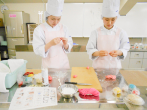 食クリエイトコース所属の2年生が、「洋菓子応用実習」でマジパン細工を学びました。