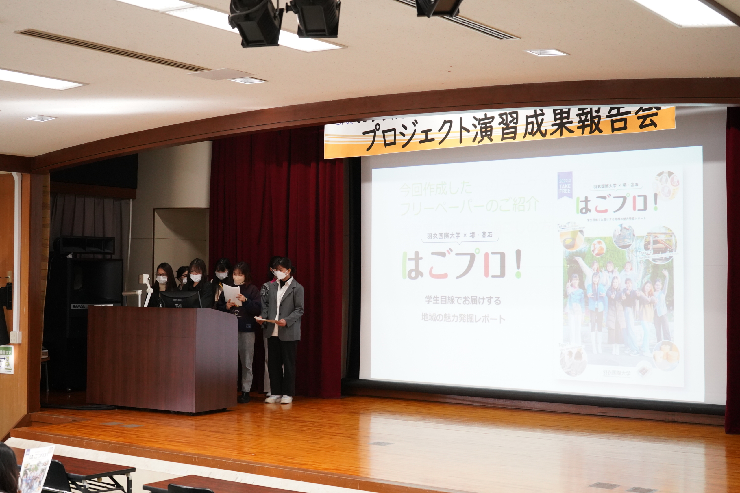 報告会では、フリーペーパー制作に向け、様々な外部協力者の方から講義を受けたことや、科目協力者の真生印刷株式会社の工場を見学させてもらった様子、また自分たち自身で羽衣周辺地域の施設やお店へ取材に行き、フリーペーパーの紙面を作り上げた様子が報告されました。