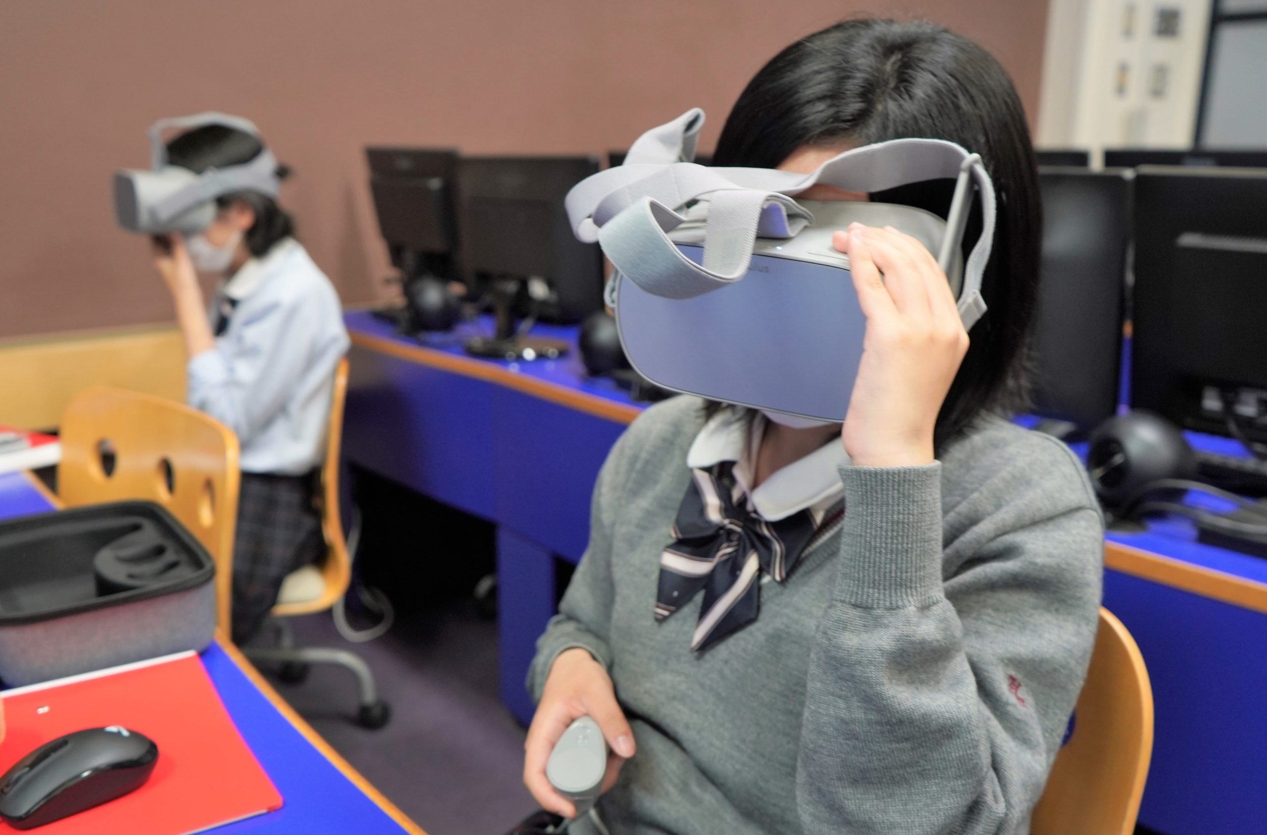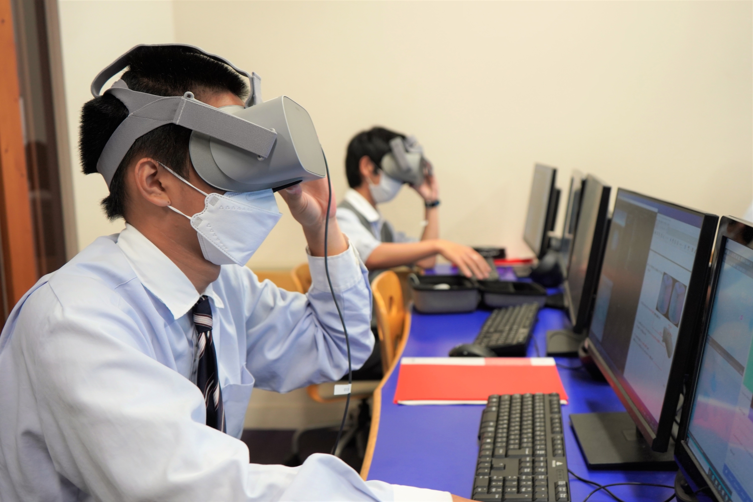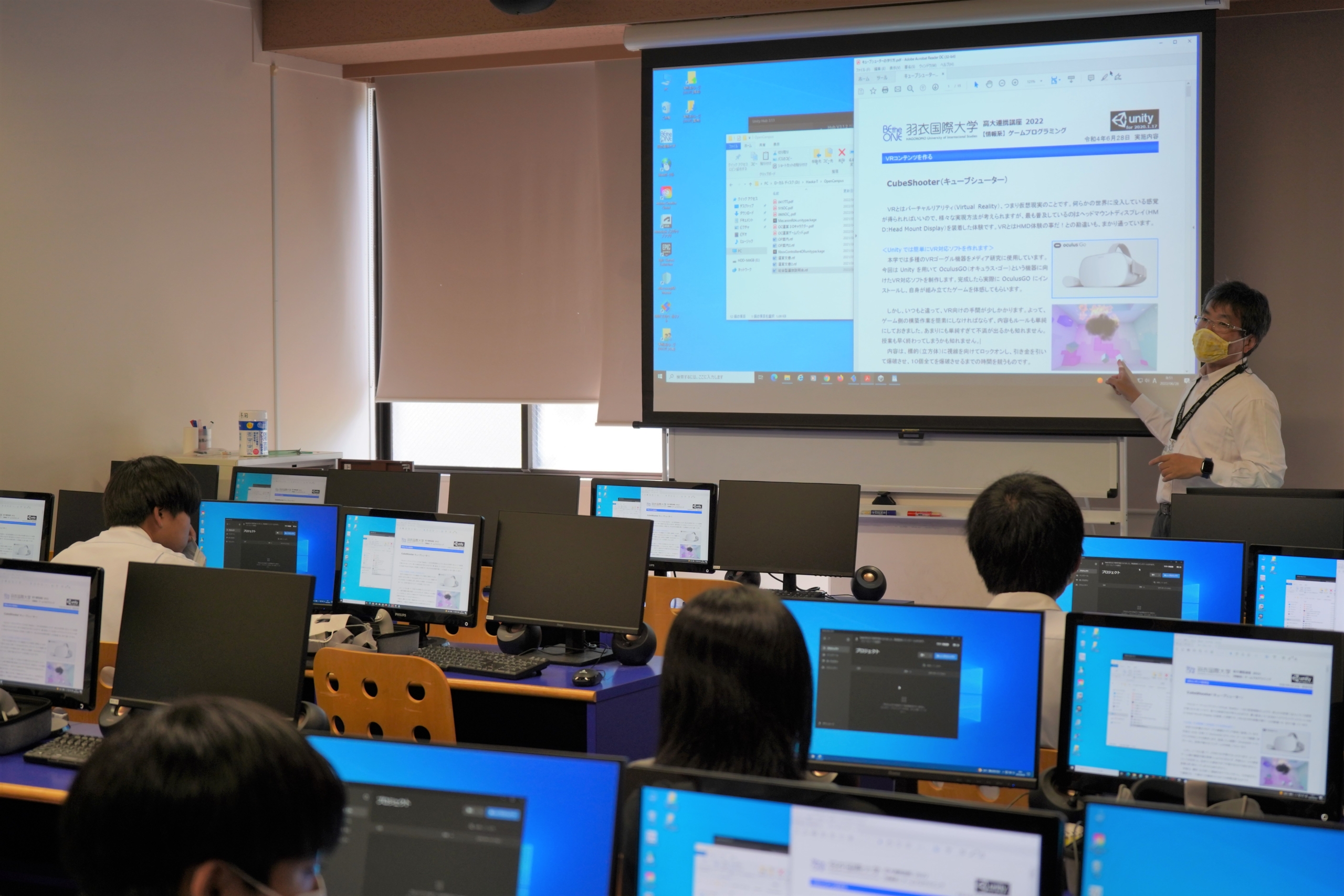 キューブシューターというゲームコンテンツ制作を教材に用い、VRゴーグルの装着体験をした生徒からはVR空間への没入感に感嘆する声が上がり、貴重な体験ができたようです。
