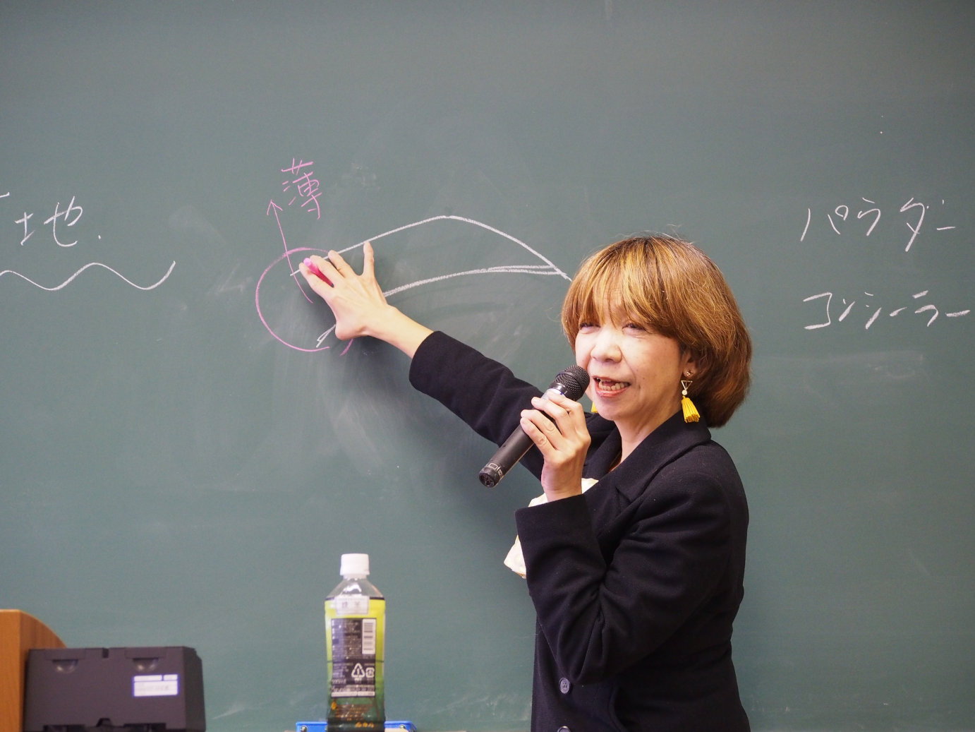 講師の道下圭子先生からは、「普段のメイクと就活メイクの違い」についてお話しいただき、アイブロウやアイメイク、リップなどパーツごとのポイント解説ののちに、学生自らメイクを実践しました。