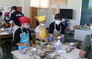 《料理教室》は湯浅小学校で午前中に開催。人間生活学科 食クリエイトコースの山本幸恵講師とゼミ生5名が《料理教室》の講師を務めました。