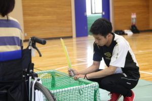 車椅子の方、片手が不自由な方でも楽しめる団体競技のスポーツです。チーム対抗(11人)で椅子に座り、手に持った棒を使ってサッカーボールを自分たちのゴールに入れる競技で、勝つための練習・役割分担・作戦会議を行うなどの面白さがあり、真剣勝負に挑むことによって喜びや感動を得ることを目的としています。