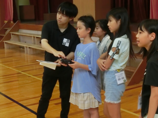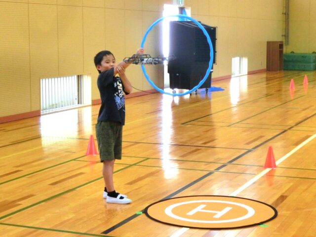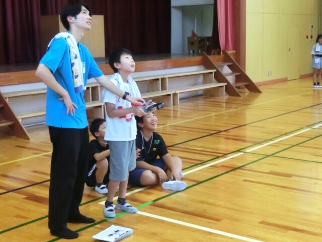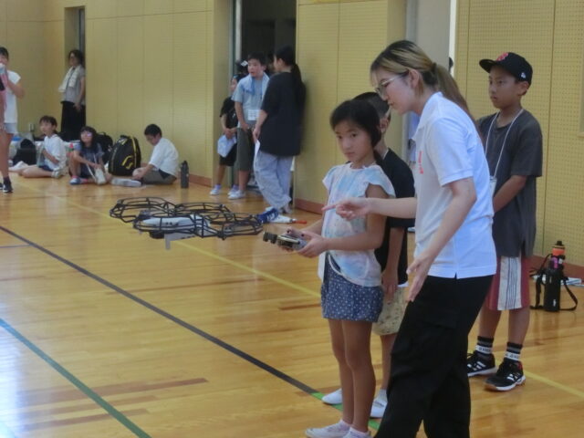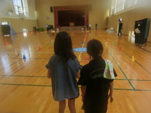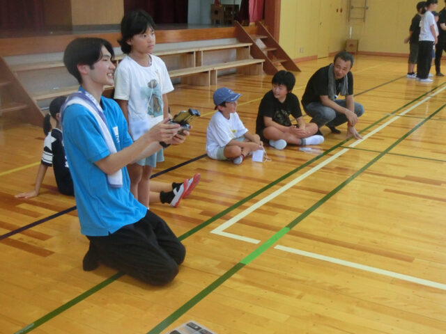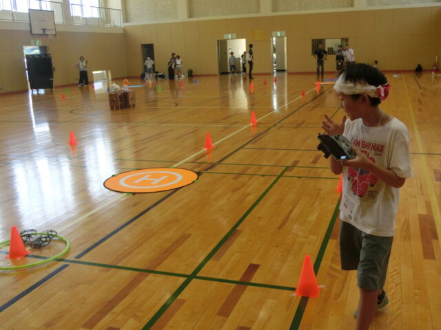 湯浅町田区民センターの体育館では、放送・メディア映像学科 玉井敏晴准教授の監修のもと、ドローンクラブSkyMedia部の学生たちが子どもたちに操縦の指導を行いました。
