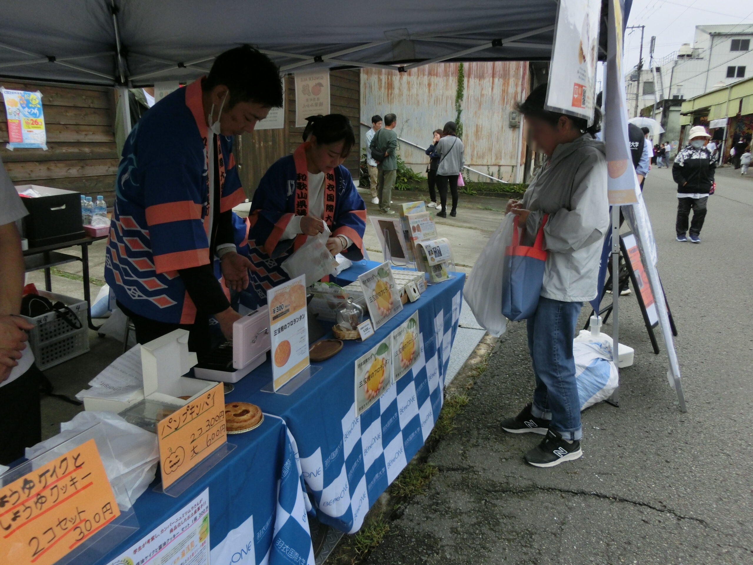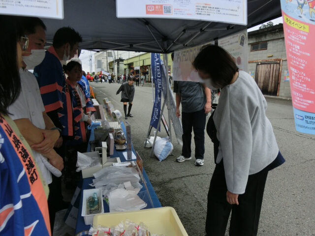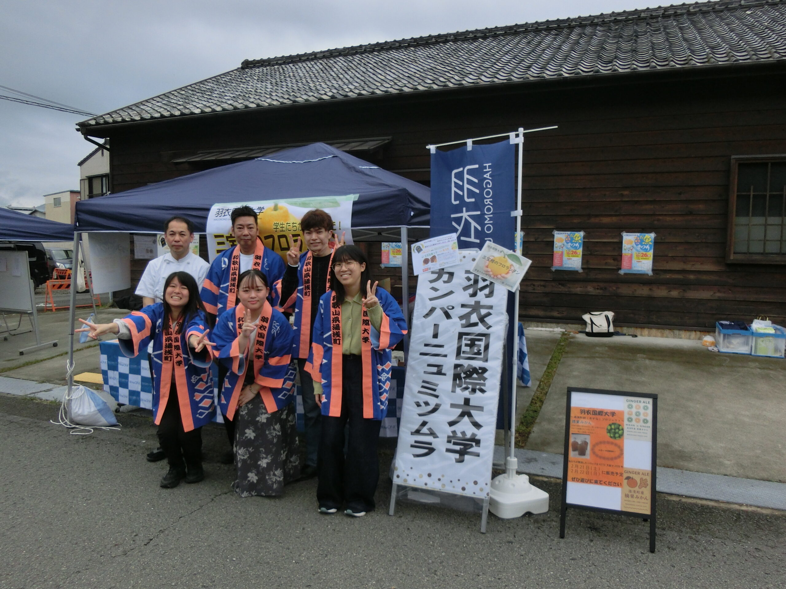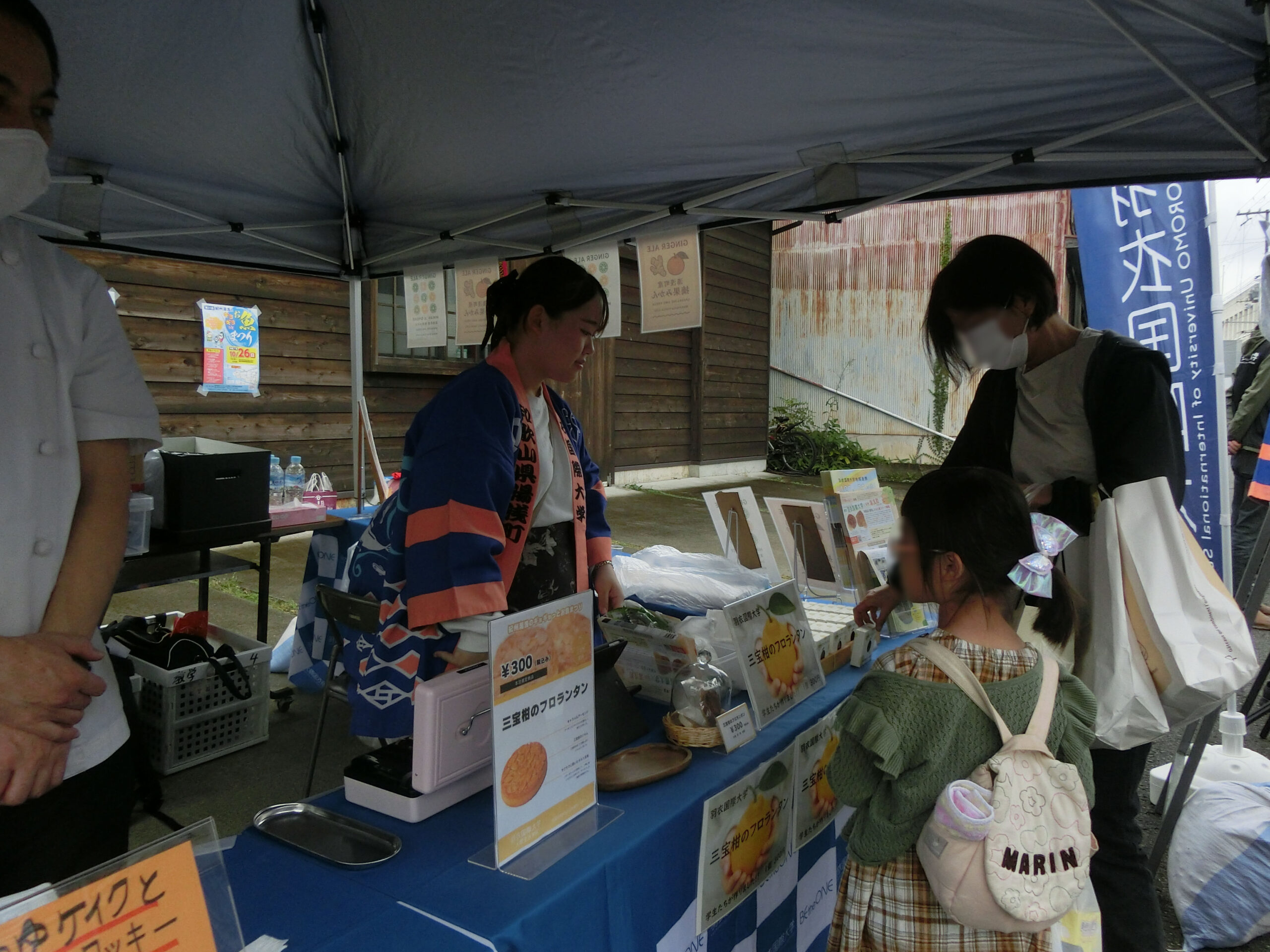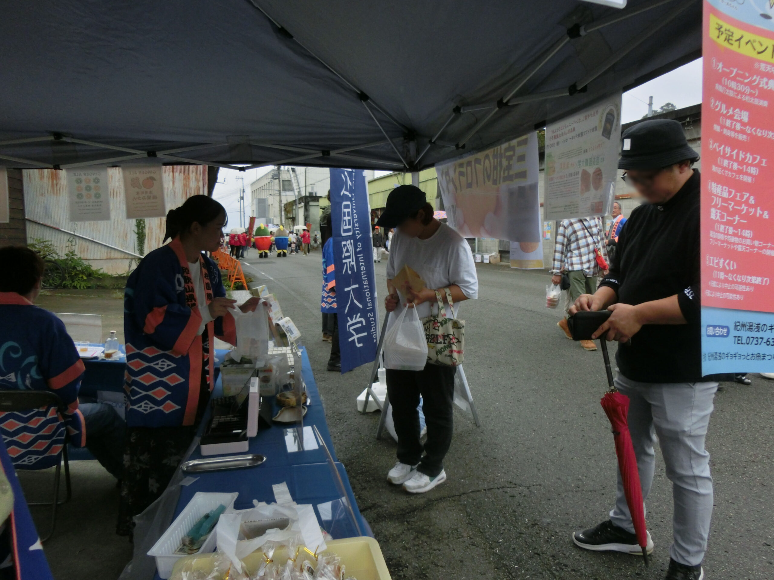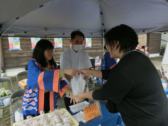 お客さんの中には、昨年の祭りで販売した「ゆず金山寺味噌マドレーヌ」が美味しかったから、今年も楽しみにしてましたと声をかけてくださる方もいました。学生たちも商品の説明をしたり、お客さんとの会話を楽しんでいました。また、前のブースで出店していた農家さんからスダチをプレゼントされるなど、湯浅町の人々と交流し、湯浅町を満喫しました。