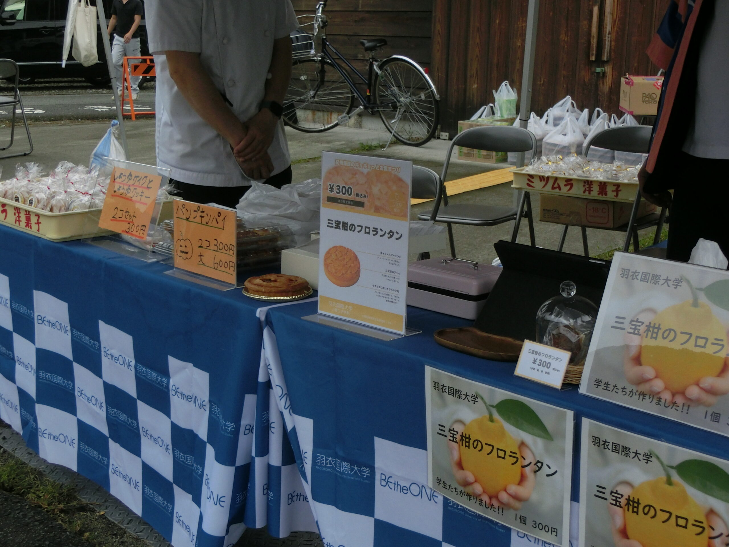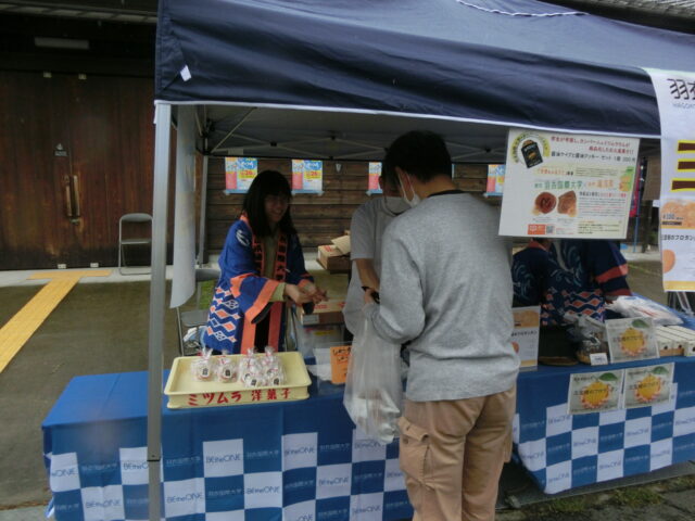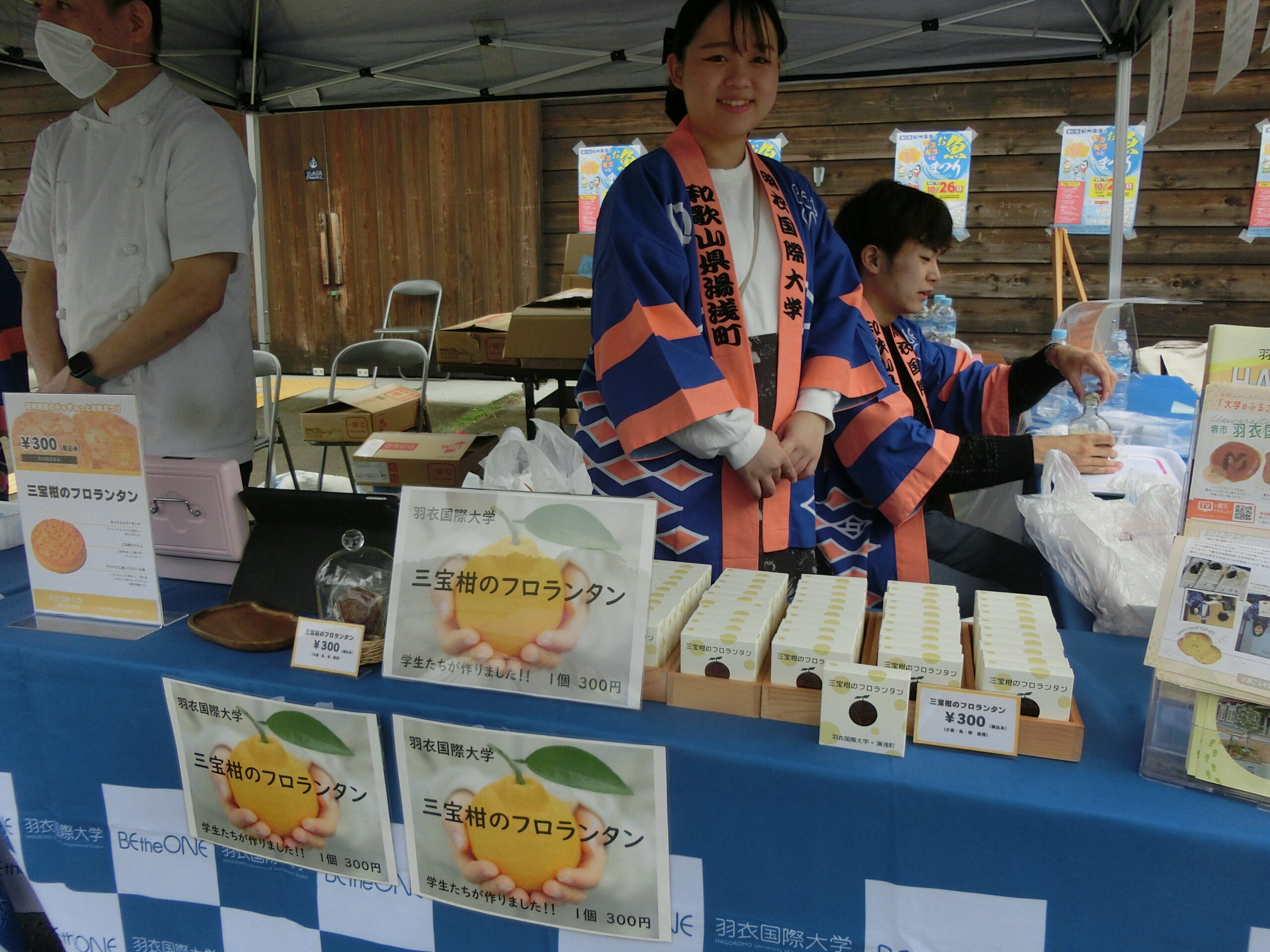 小雨が降る中、人間生活学科 食クリエイトコース生1名と有志ボランティア3名が「第21回 紀州湯浅のギョギョっとお魚まつり」で、前期の正課科目「食クリエイト演習Ⅲ」で湯浅町の特産品を使用したお土産スイーツを考案し、4グループが作製した中の1品「三宝柑のフロランタン」を販売しました。