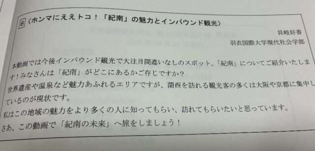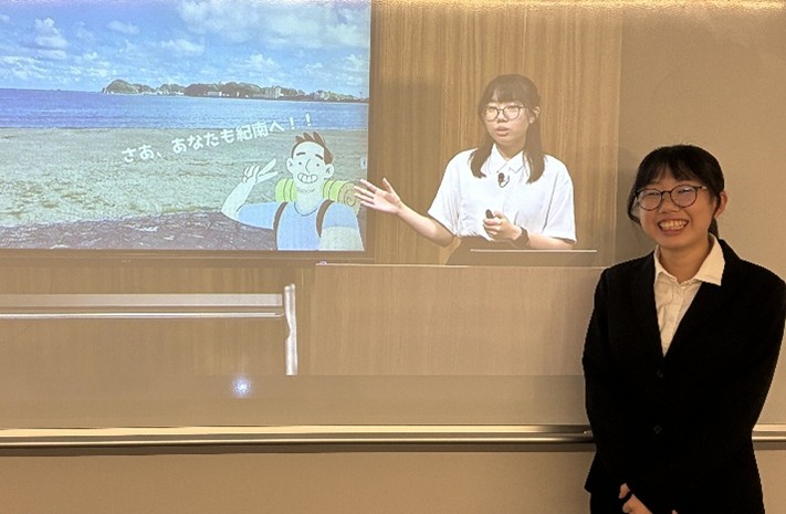 本学からは現代社会学部現代社会学科観光コース4年生の貝岐好香(かいはみ このか)さん(古谷昌重ゼミ所属)がエントリーし、「ホンマにええトコ!「紀南」の魅力とインバウンド観光」のテーマで、まだあまり知られていない「紀南」の魅力と今後のポテンシャルについて、観光分散化や、あらたな旅のスタイルの視点から紹介・提言を行いました。