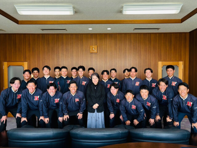10月30日(木)硬式野球部部員・部長・監督が、中川学長に近畿学生野球連盟秋季3部リーグ戦の優勝並びに9年ぶりの2部復帰を報告しました。