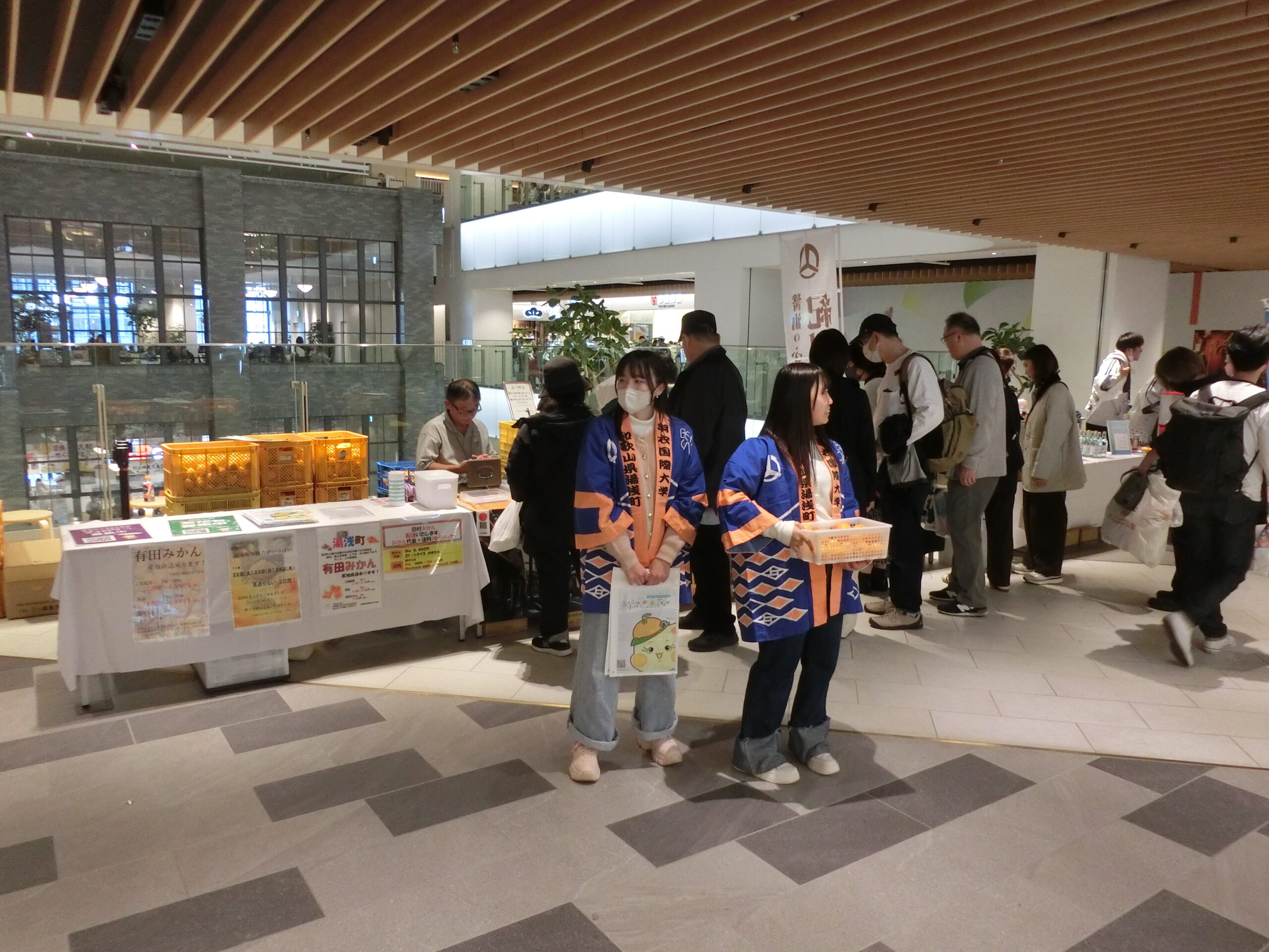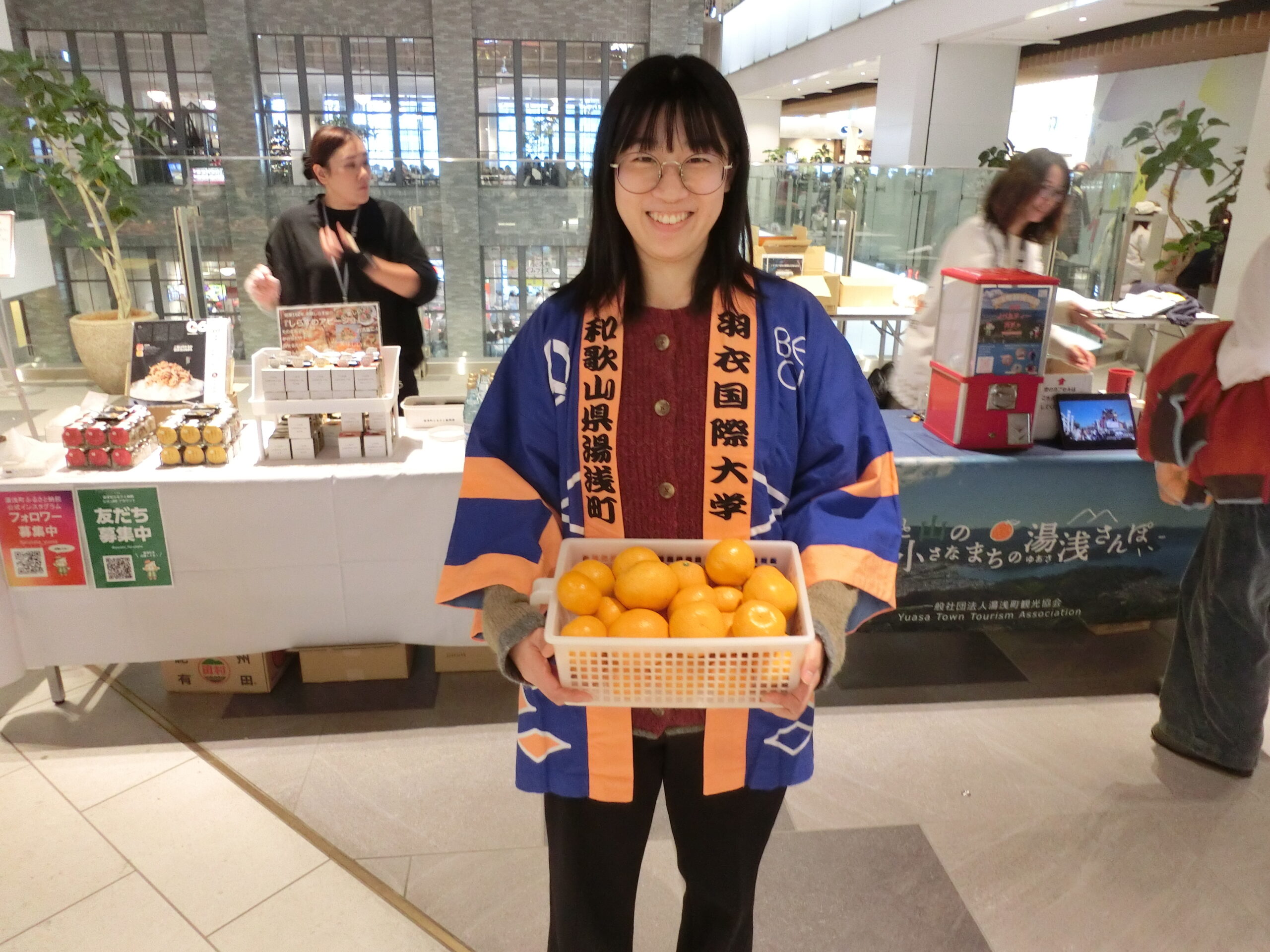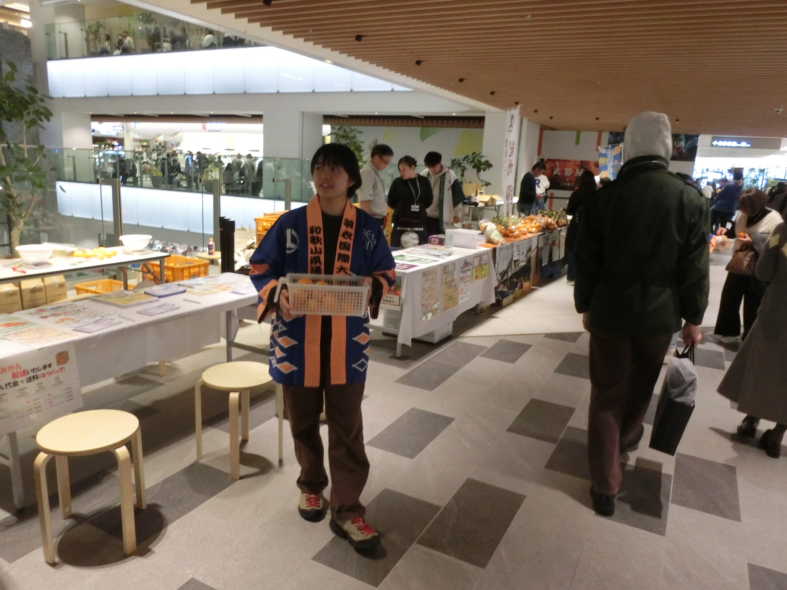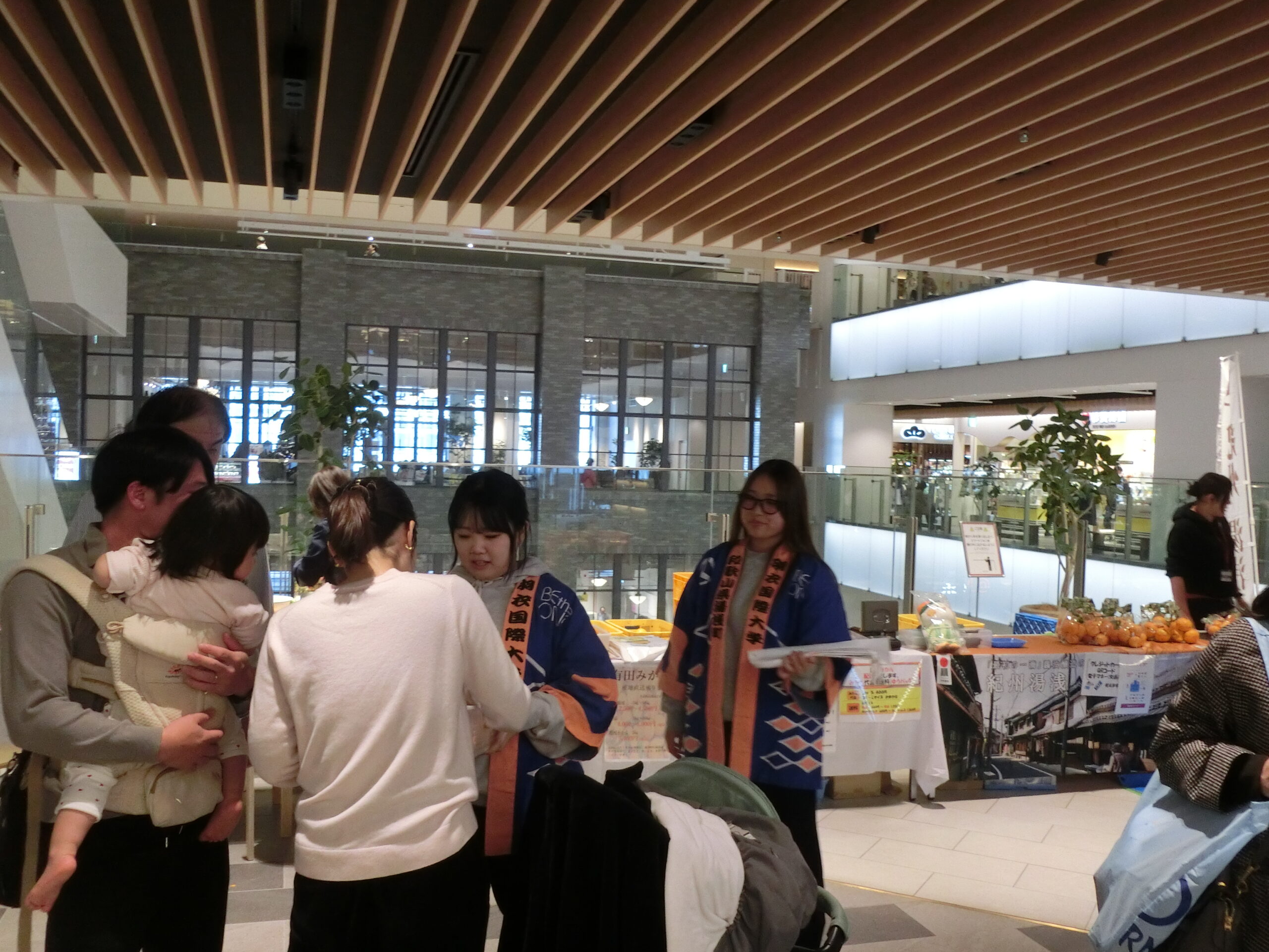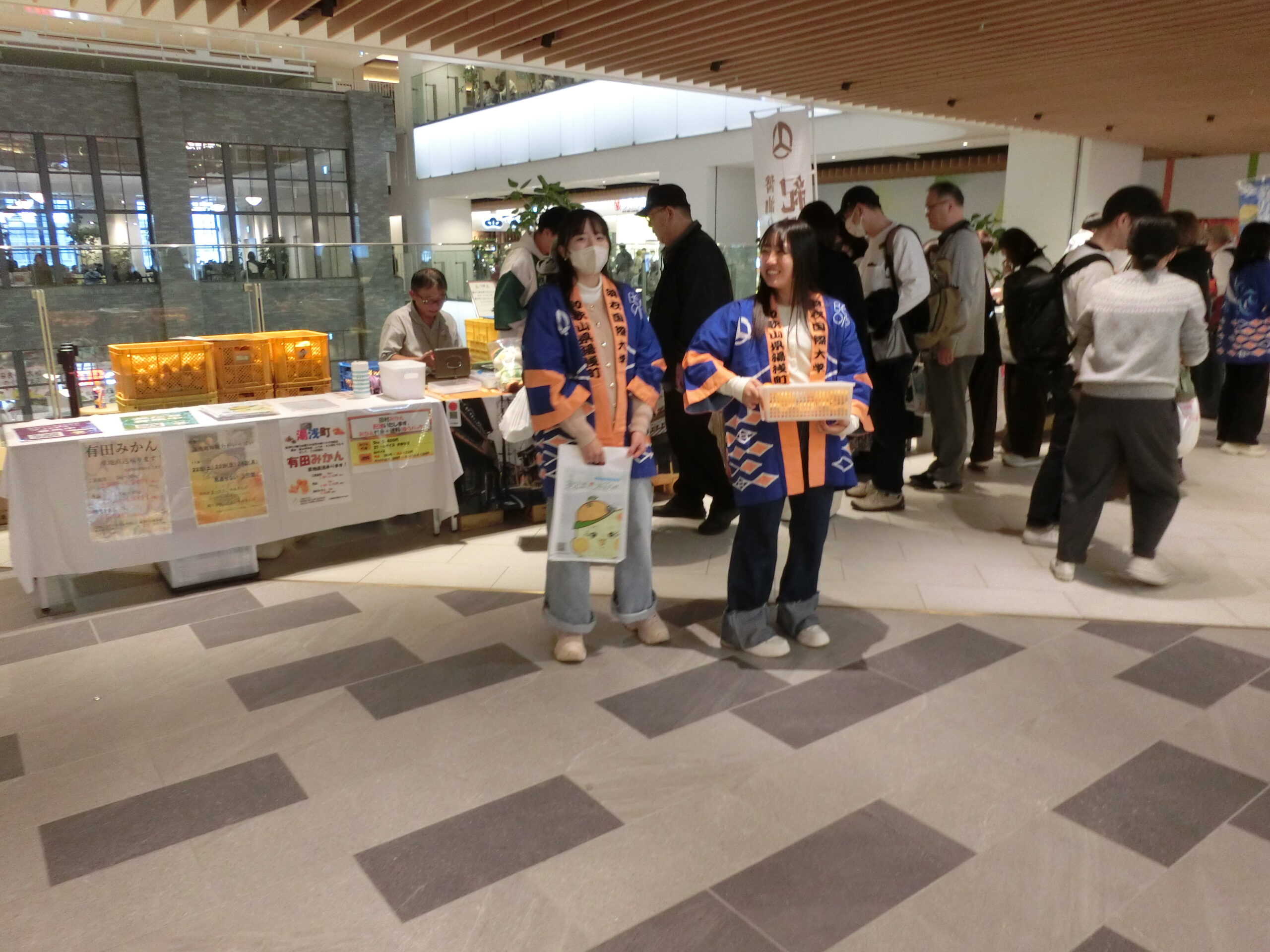 KITTE大阪3階のイベントスペースにて、現代社会学科生5名と食物栄養学科生3名が、湯浅町の特産品のひとつ「有田みかん」のPR活動を2日間行いました。