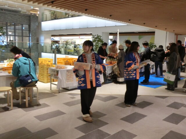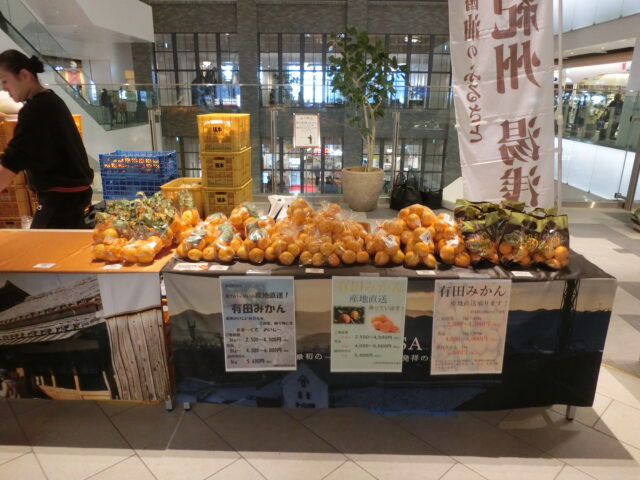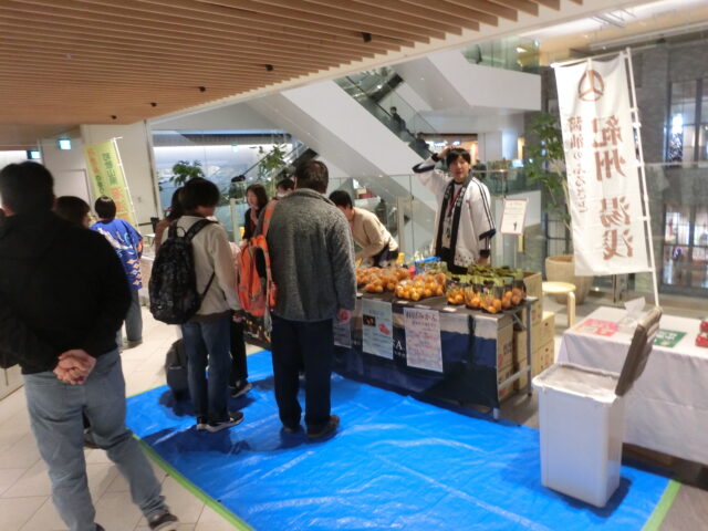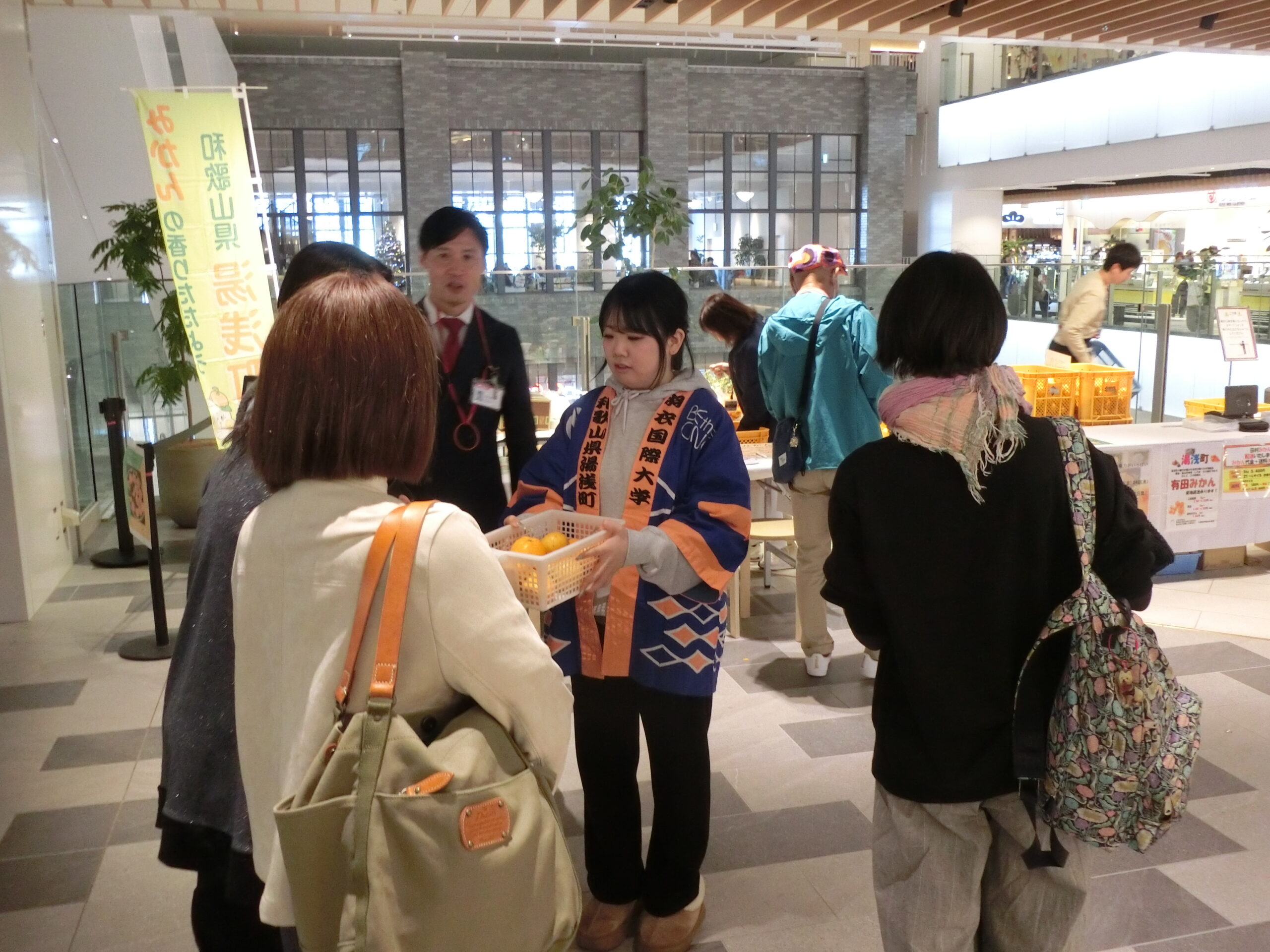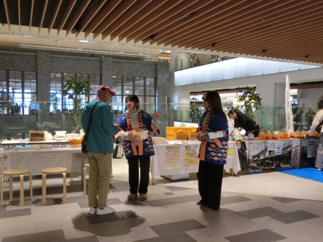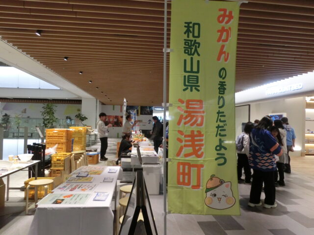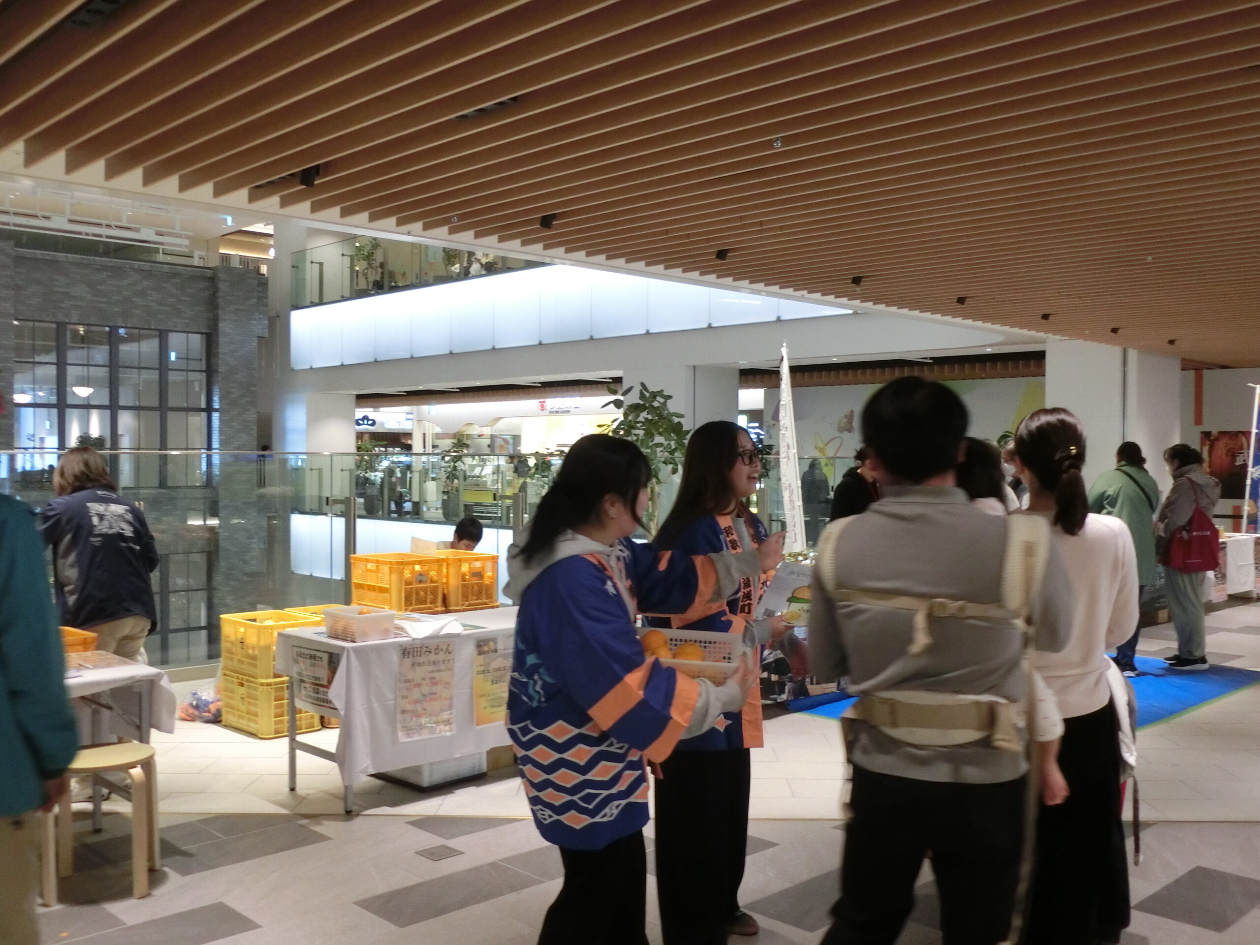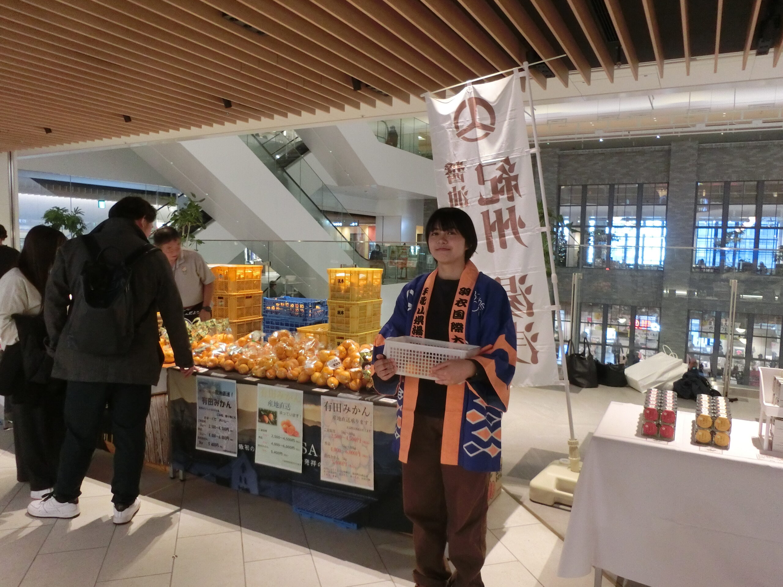 KITTE大阪3階のイベントスペースにて、現代社会学科生5名と食物栄養学科生3名が、湯浅町の特産品のひとつ「有田みかん」のPR活動を2日間行いました。
