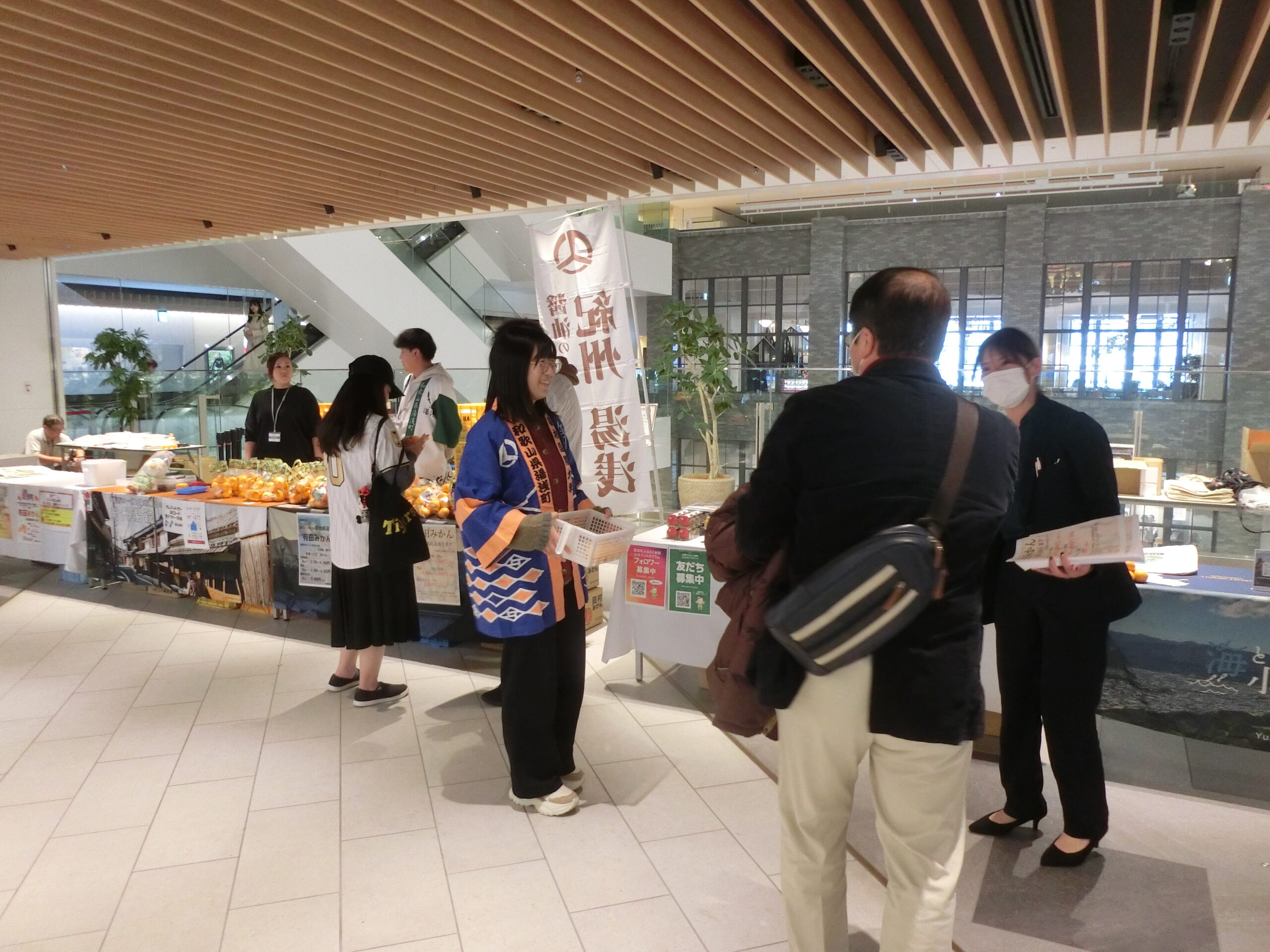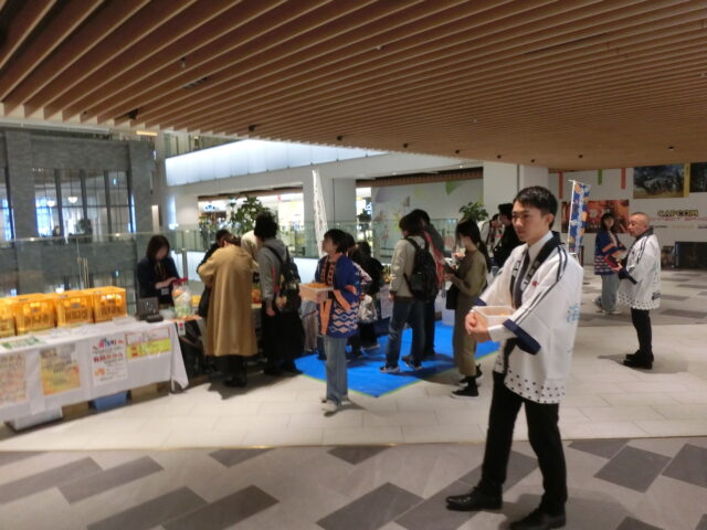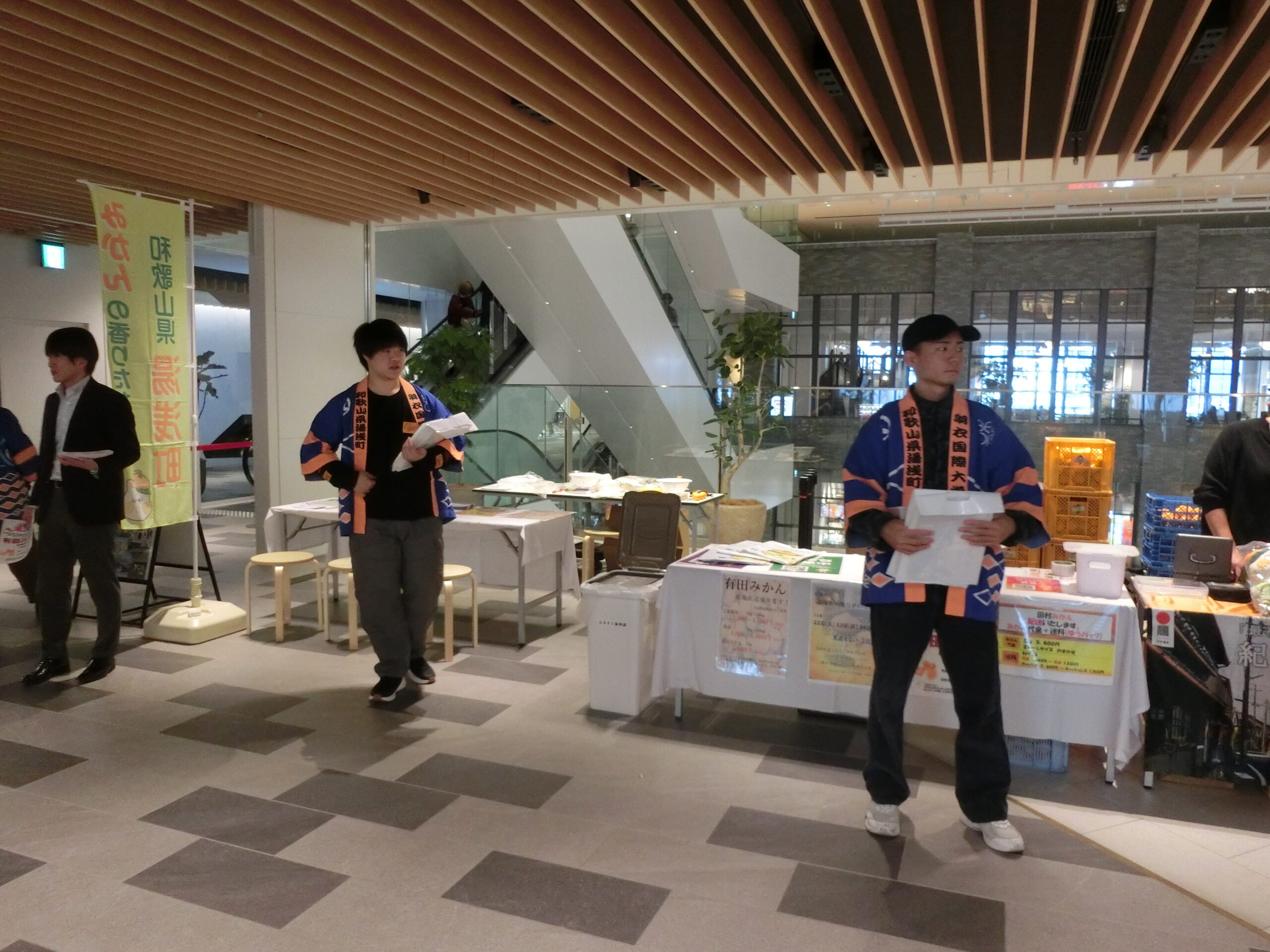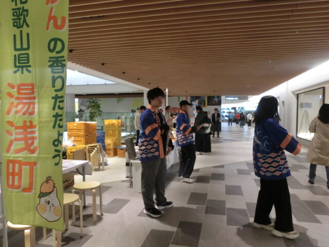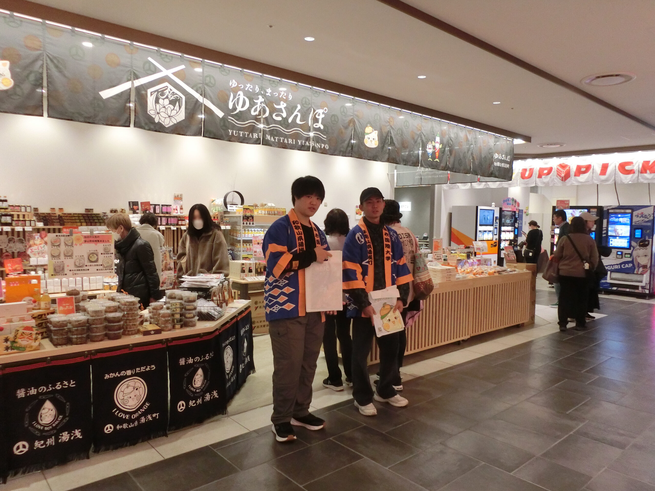 また、2階にある「和歌山県 湯浅町アンテナショップ ゆあさんぽ」前の学生たちは、みかんの試食ができる3階イベントスペースへお客さんに声かけをし、誘導しました。