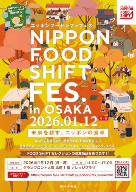 令和8年1月12日(月曜日・祝日) 、グランフロント大阪北館1F ナレッジプラザにて、農林水産省主催の「ニッポンフードシフトフェス大阪2026」 (11:00~17:00)が開催されます。