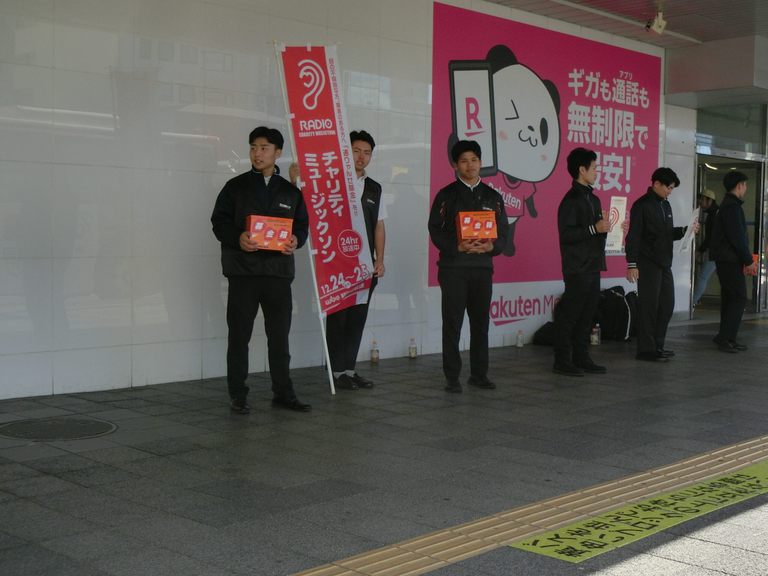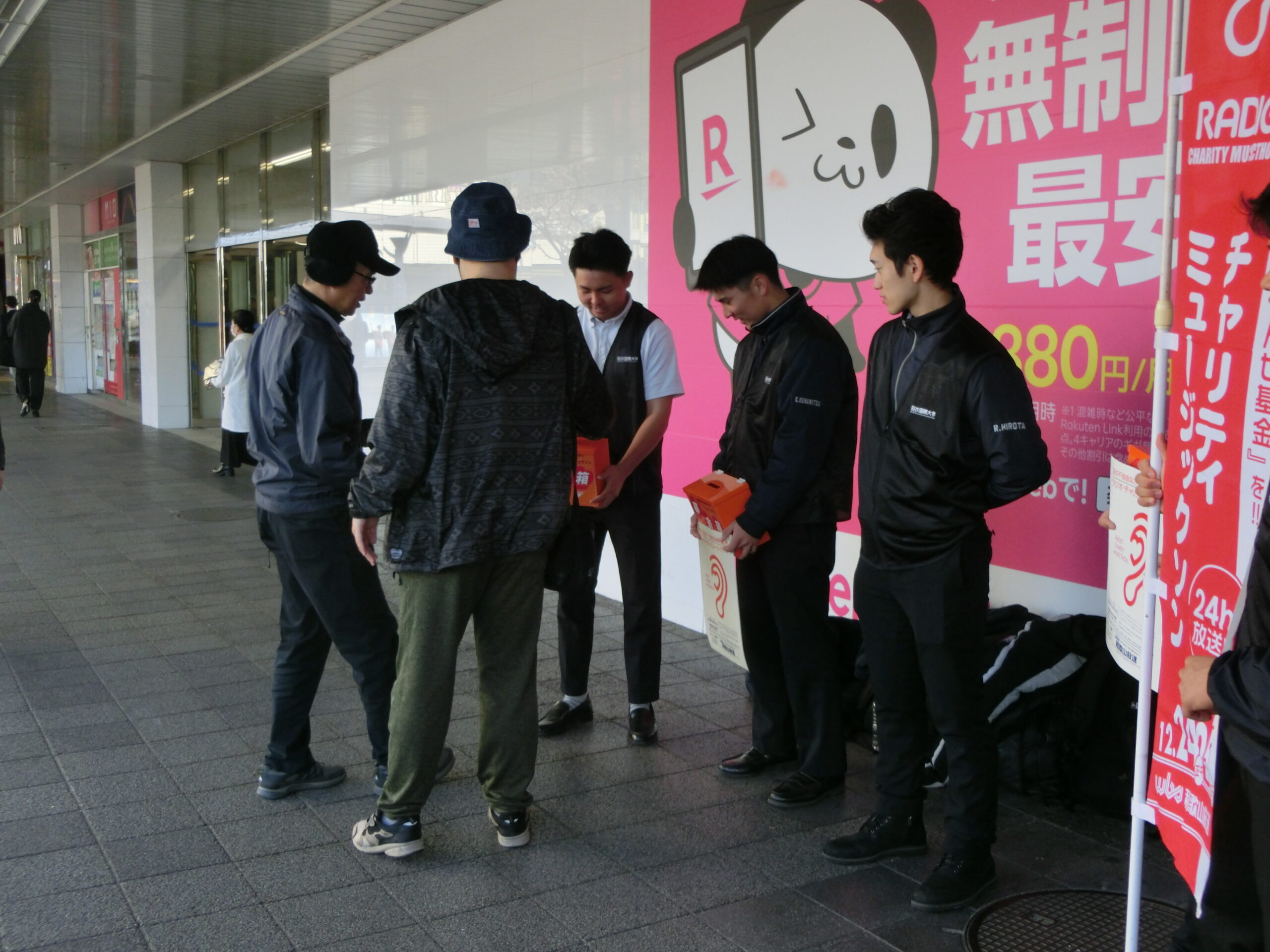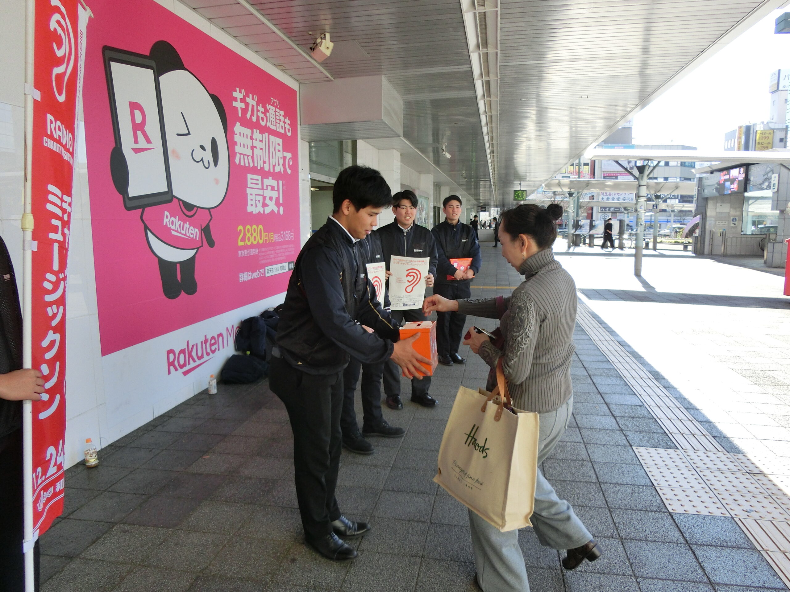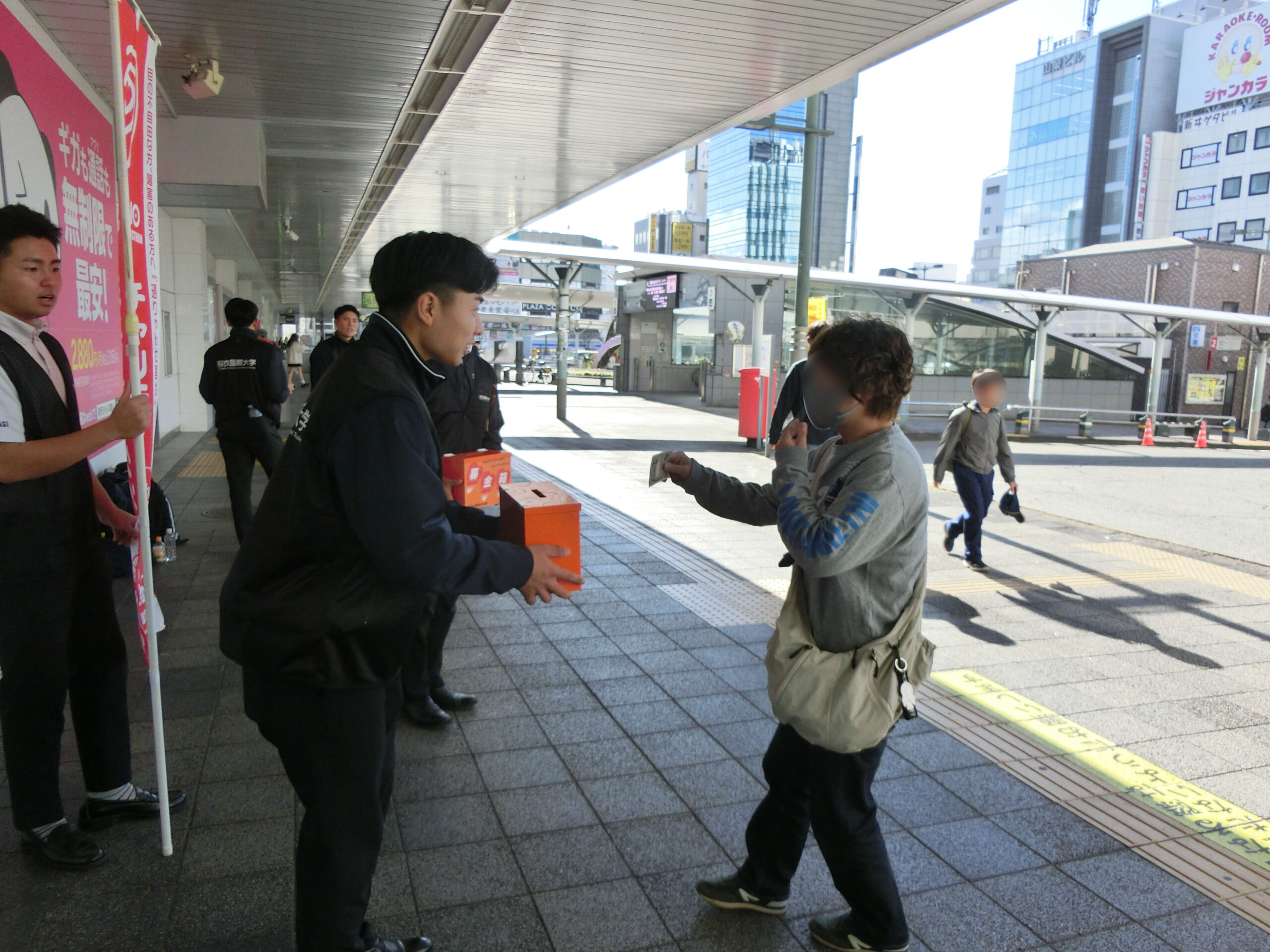 10月の気温という暖かい日差しの中、和歌山放送の担当の方からこの募金の趣旨と呼びかけの内容などの説明を受け、駅前側と百貨店入り口前の2班に分かれて、硬式野球部の学生たちの遠慮気味の声で街頭募金が始まりました。