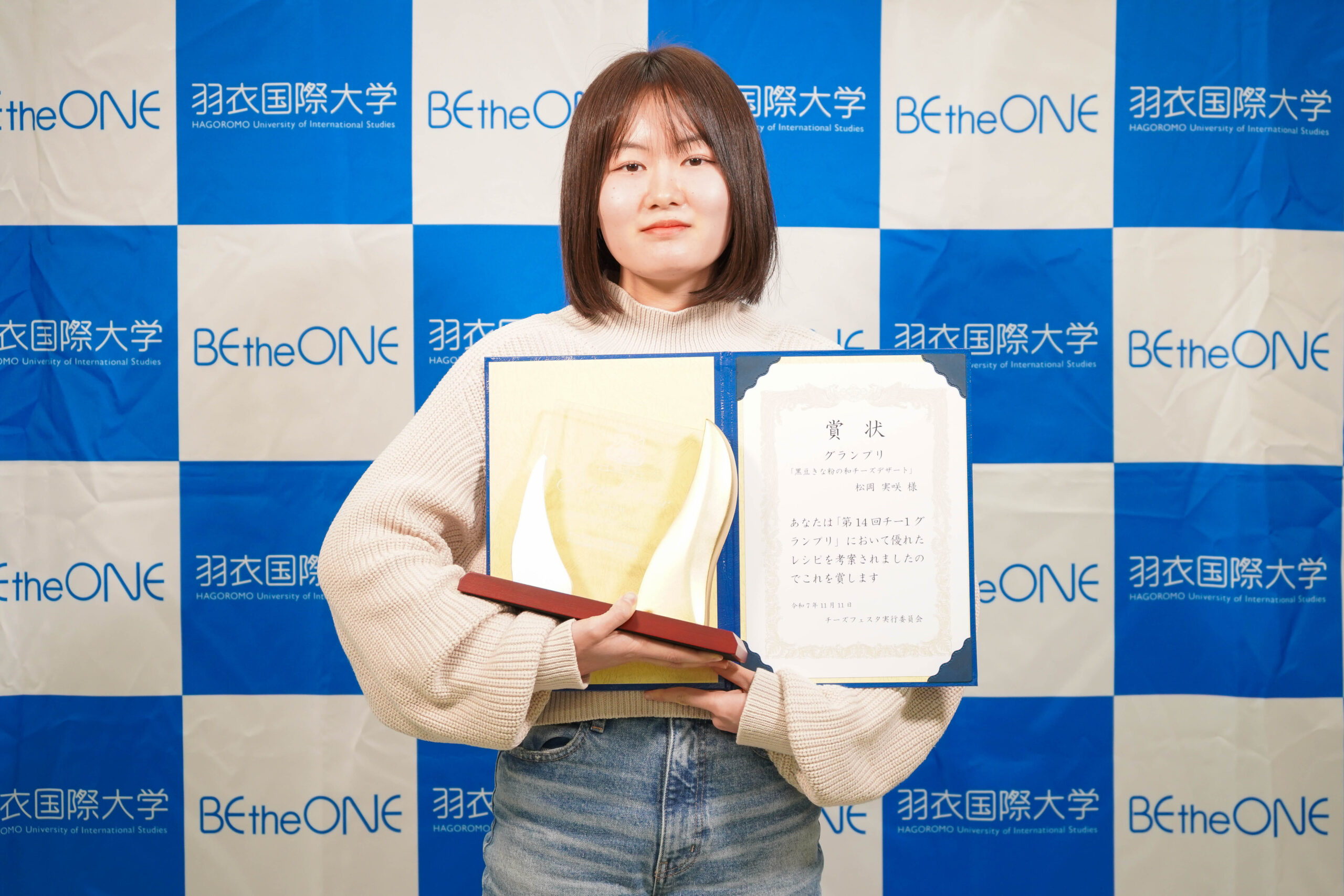 人間生活学科 食クリエイトコース2年の松岡実咲さん(兵庫県 しとろんさん)が、チーズ普及協議会主催「第14回チー1グランプリ」において、グランプリを受賞しました。本コンテストは、ご当地食材・郷土料理とチーズを組み合わせたオリジナルレシピを競う全国規模の大会で、今年度は応募総数1,557点の中から地域選抜12作品が選出。その頂点に、松岡さんの作品が輝きました。