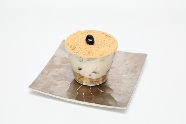 黒豆のやさしい甘さに、マスカルポーネのコク、クリームチーズのほどよい酸味が加わることで、濃厚ながらも食べやすい味わいに仕上げられています。ココットの底に敷いたビスケットは食感を残し、スプーンですくいやすい工夫も施されました。