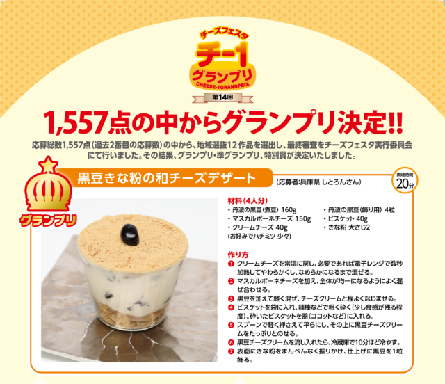 松岡さんの受賞作は「黒豆きな粉の和チーズデザート」。ご当地食材である丹波の黒豆とマスカルポーネチーズとクリームチーズを組み合わせた、和と洋が調和する一品です。