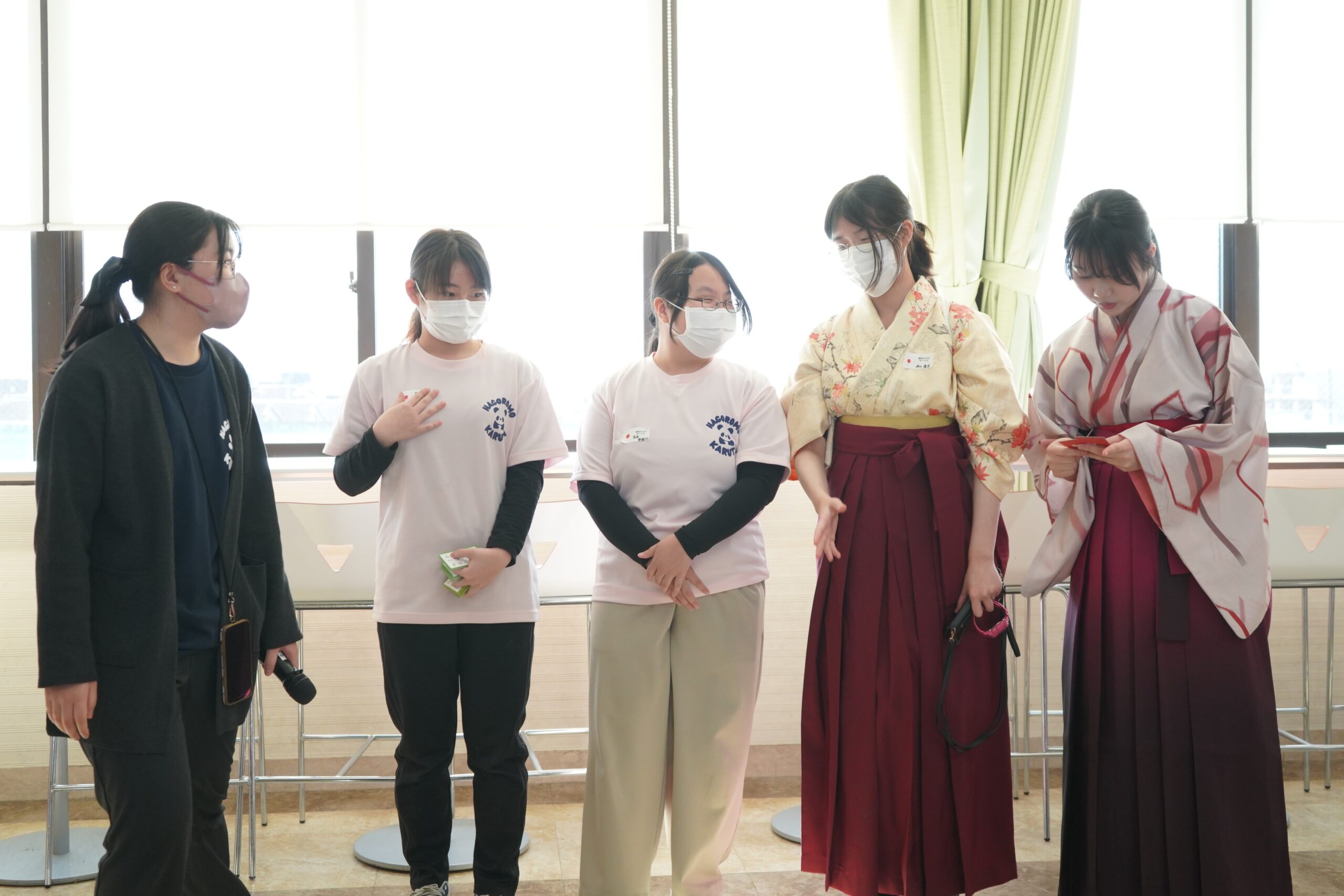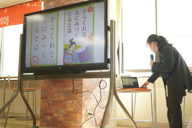 パーティでは、競技かるたサークルによる競技かるたの実演が披露されました。華やかな袴姿の部員による迫力ある試合の様子に、会場からは大きな歓声が上がりました。