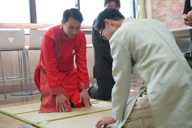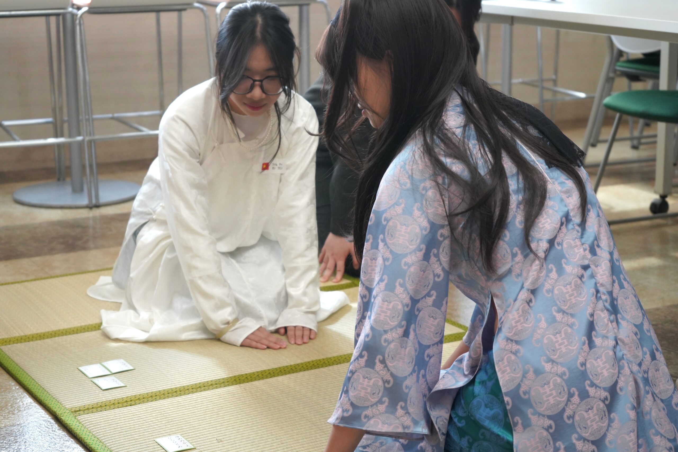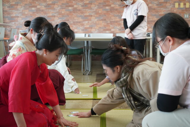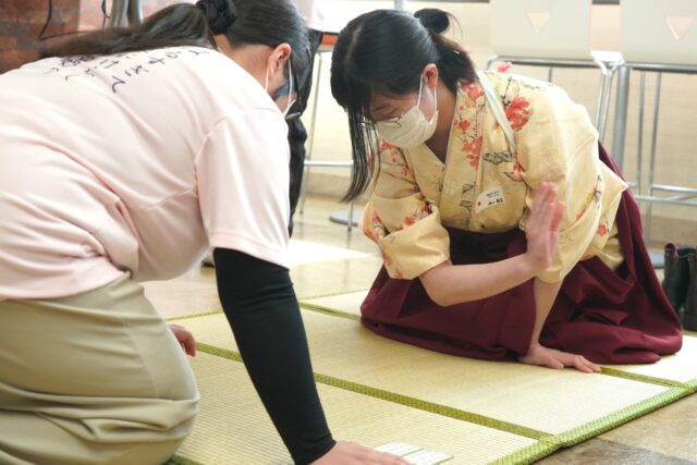 競技かるたのルール説明の後には、留学生や参加した日本人学生も実際にかるたに挑戦しました。競技かるた初挑戦ながらも、部員による丁寧なレクチャーを受け、白熱の試合が繰り広げられました。