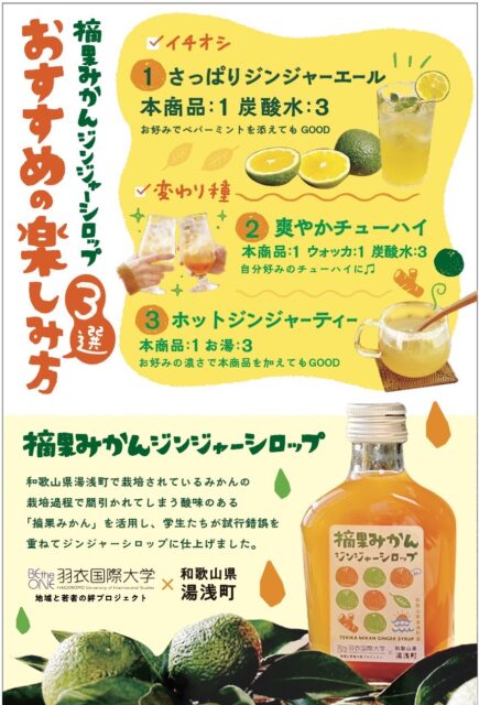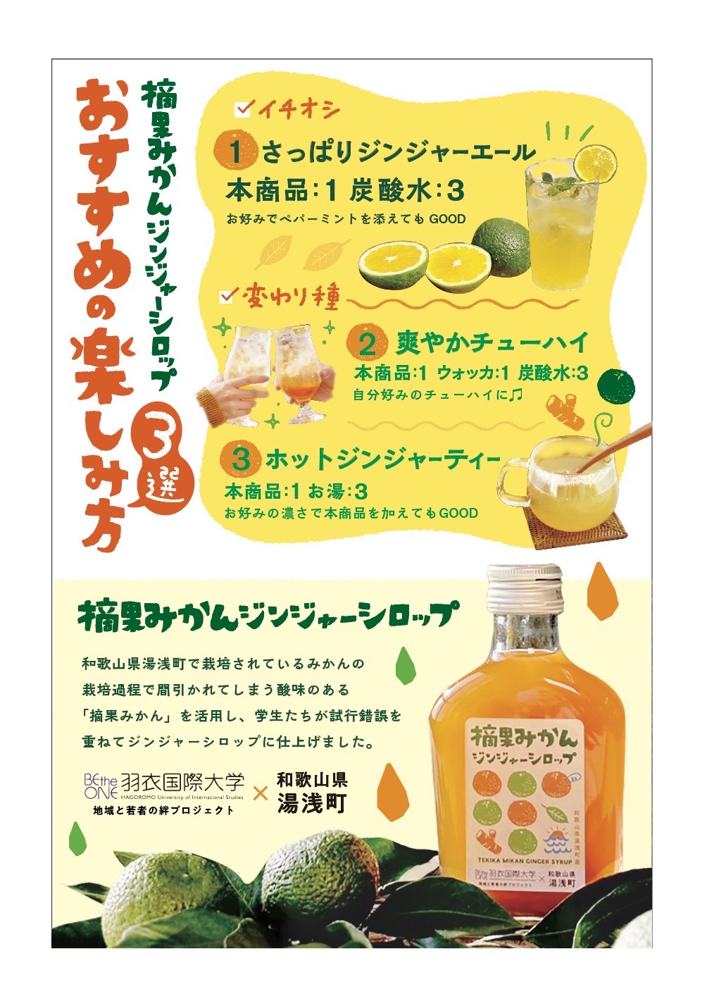 「摘果みかんジンジャーシロップ」は、学生を中心にたくさんの方々のご協力を得て完成した商品です。摘果みかんの爽やかさとスパイス、ジンジャーのほどよい辛味で絶妙なシロップに仕上がりました。